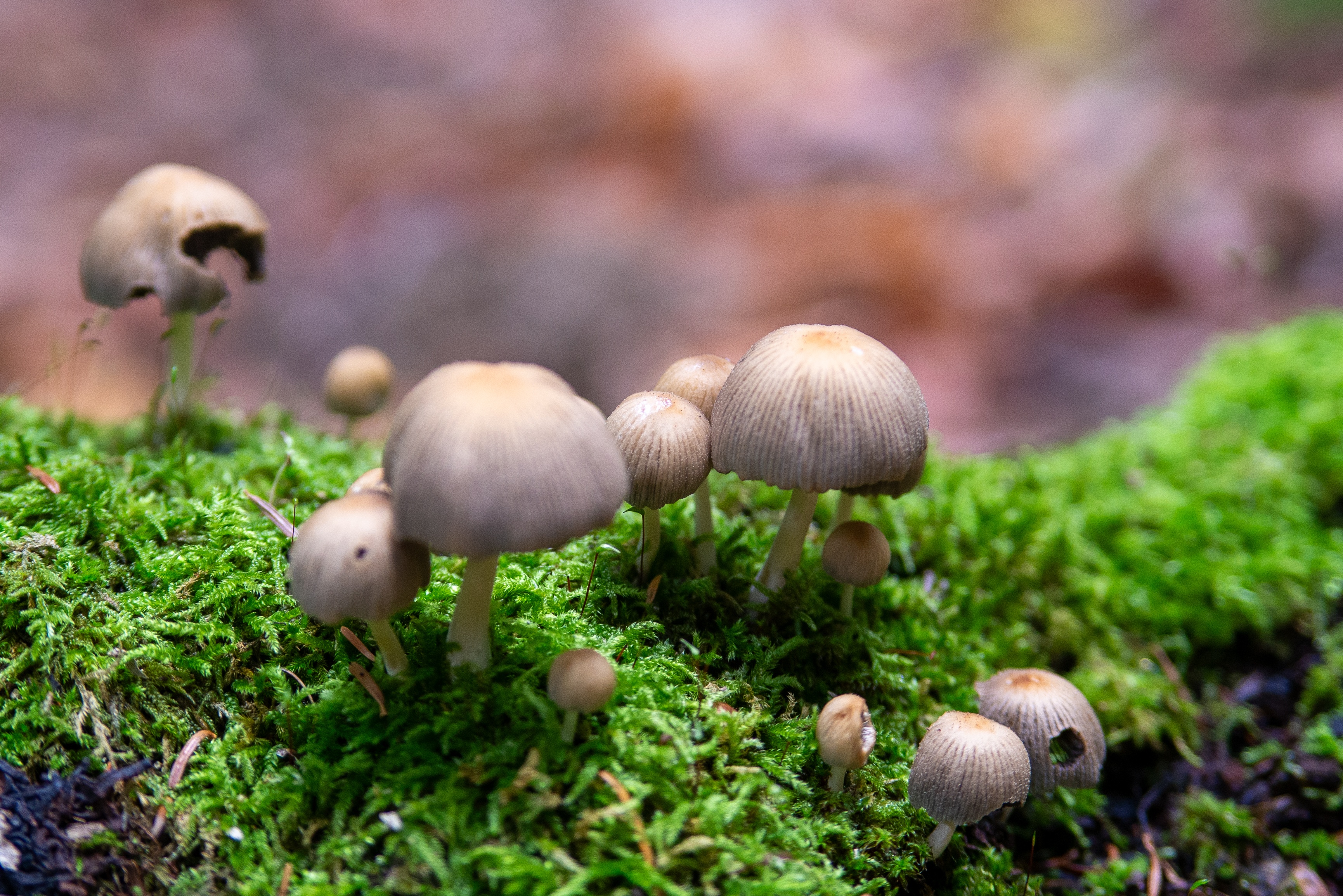 Макроснимок небольшой семьи диких грибов, растущих на ярко-зеленом мху. На мягко размытом фоне виден осенний лесной покров Адыгеи.