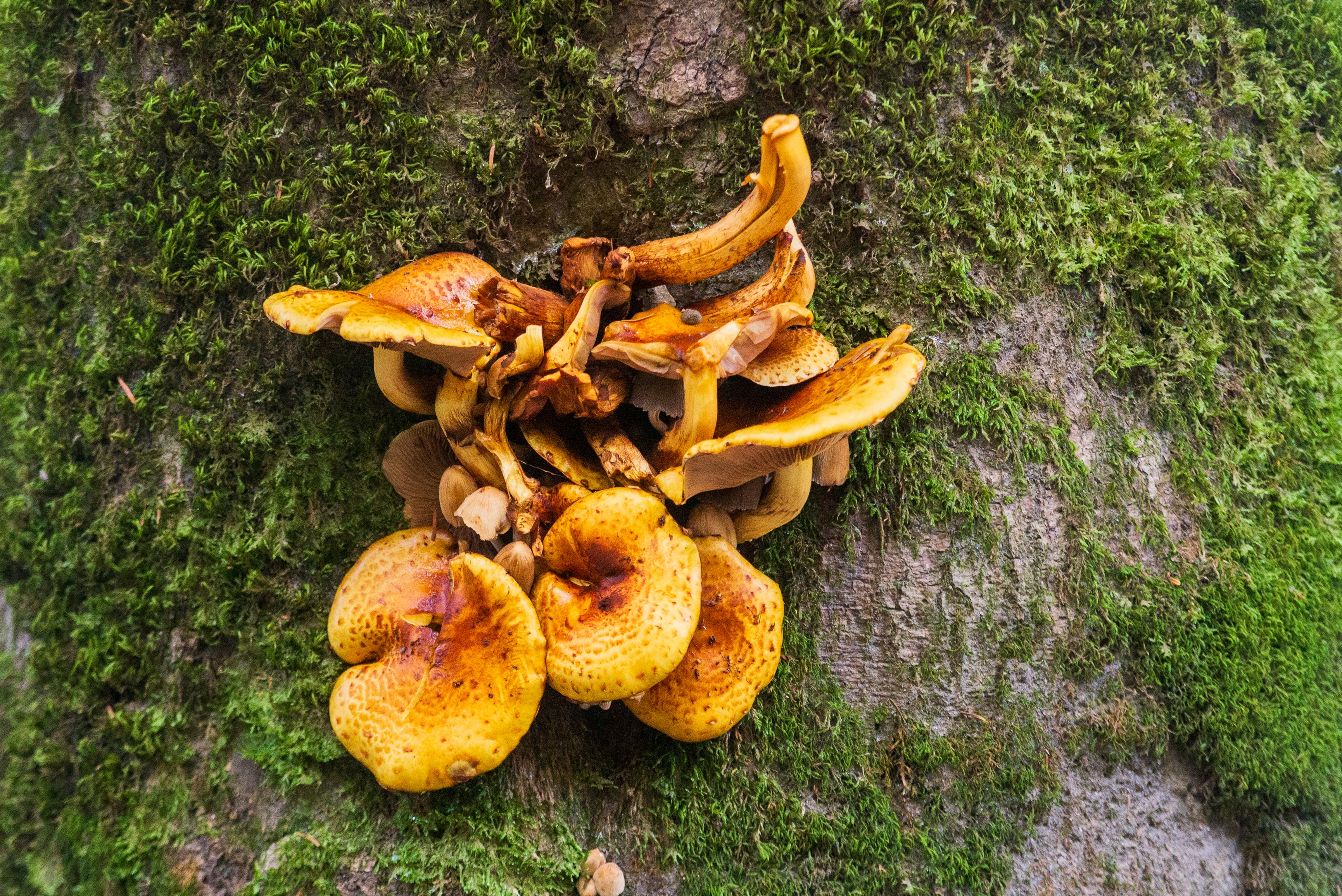 Яркая гроздь диких опят растет на стволе дерева, покрытом зеленым мхом, в осеннем лесу в Адыгее.