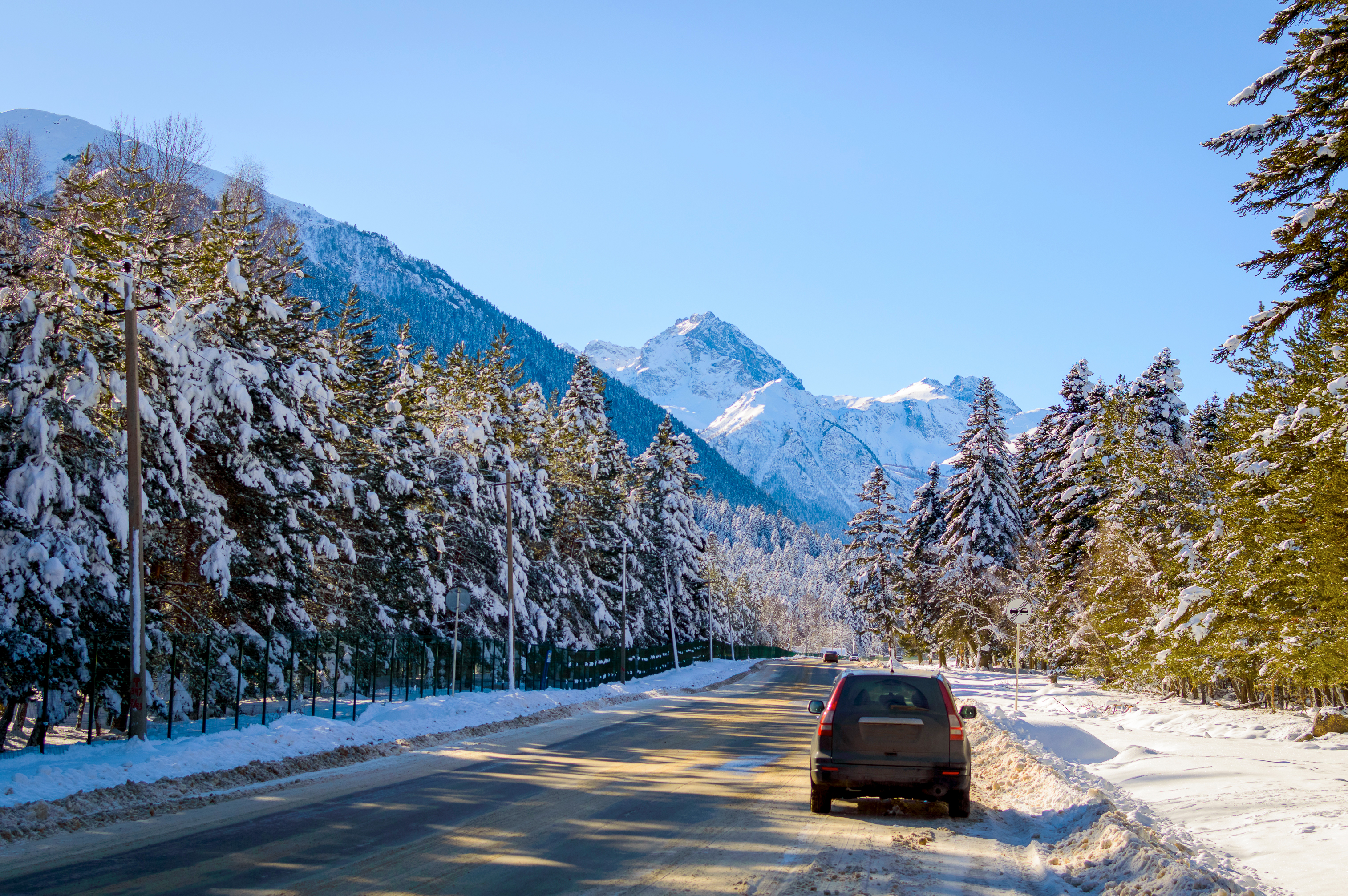 Захватывающий зимний пейзаж, где дорога извивается среди величественных заснеженных гор. Солнечные лучи играют на склонах, освещая пушистый снег, покрывающий ели и скалы. На обочине стоит автомобиль, готовый к путешествию по этой живописной местности. Яркое голубое небо контрастирует с белизной снега и темной зеленью хвойных деревьев, создавая ощущение чистоты и свежести.