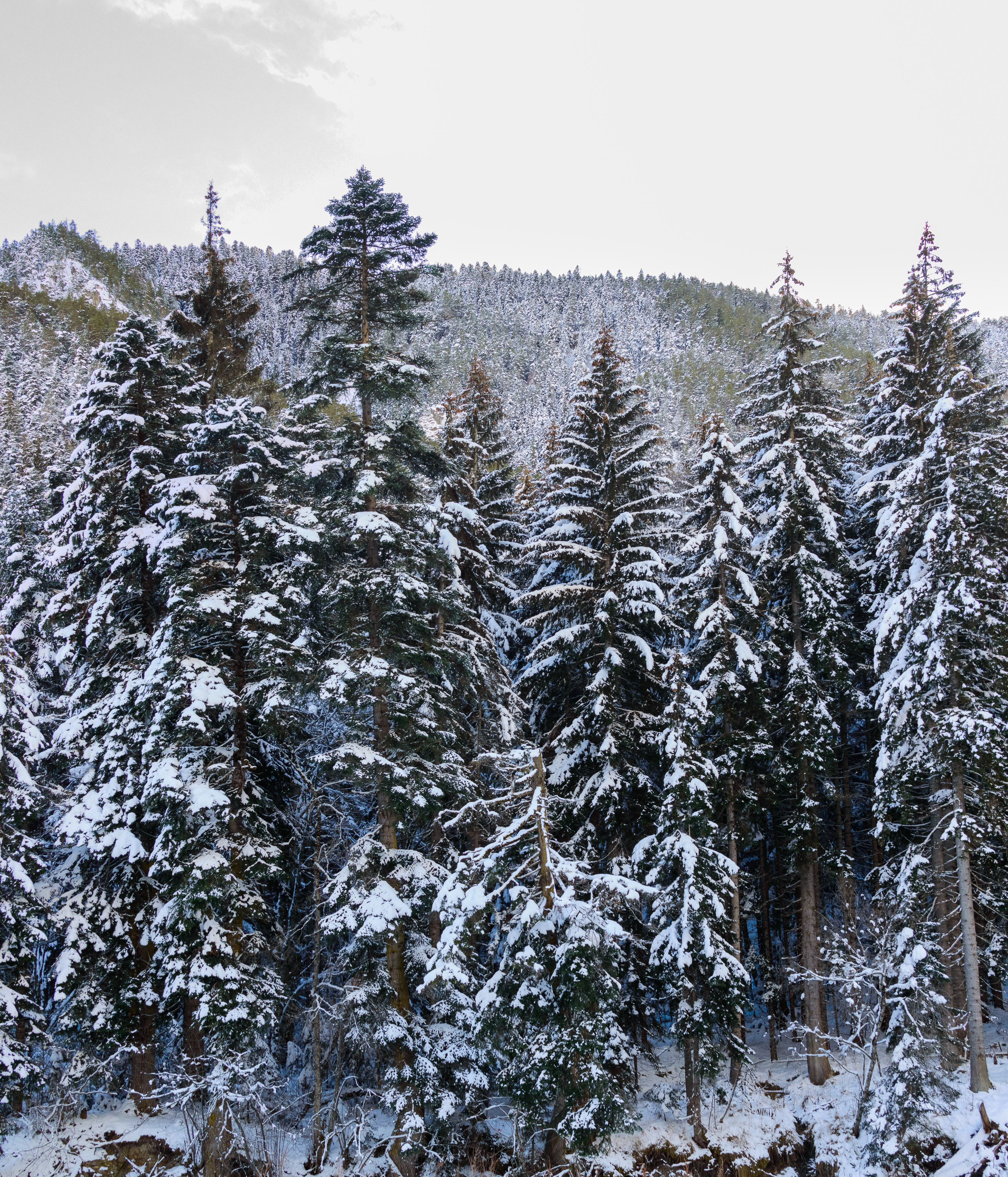 Величественные ели, укутанные пушистым снегом, создают сказочную зимнюю атмосферу в горном лесу.