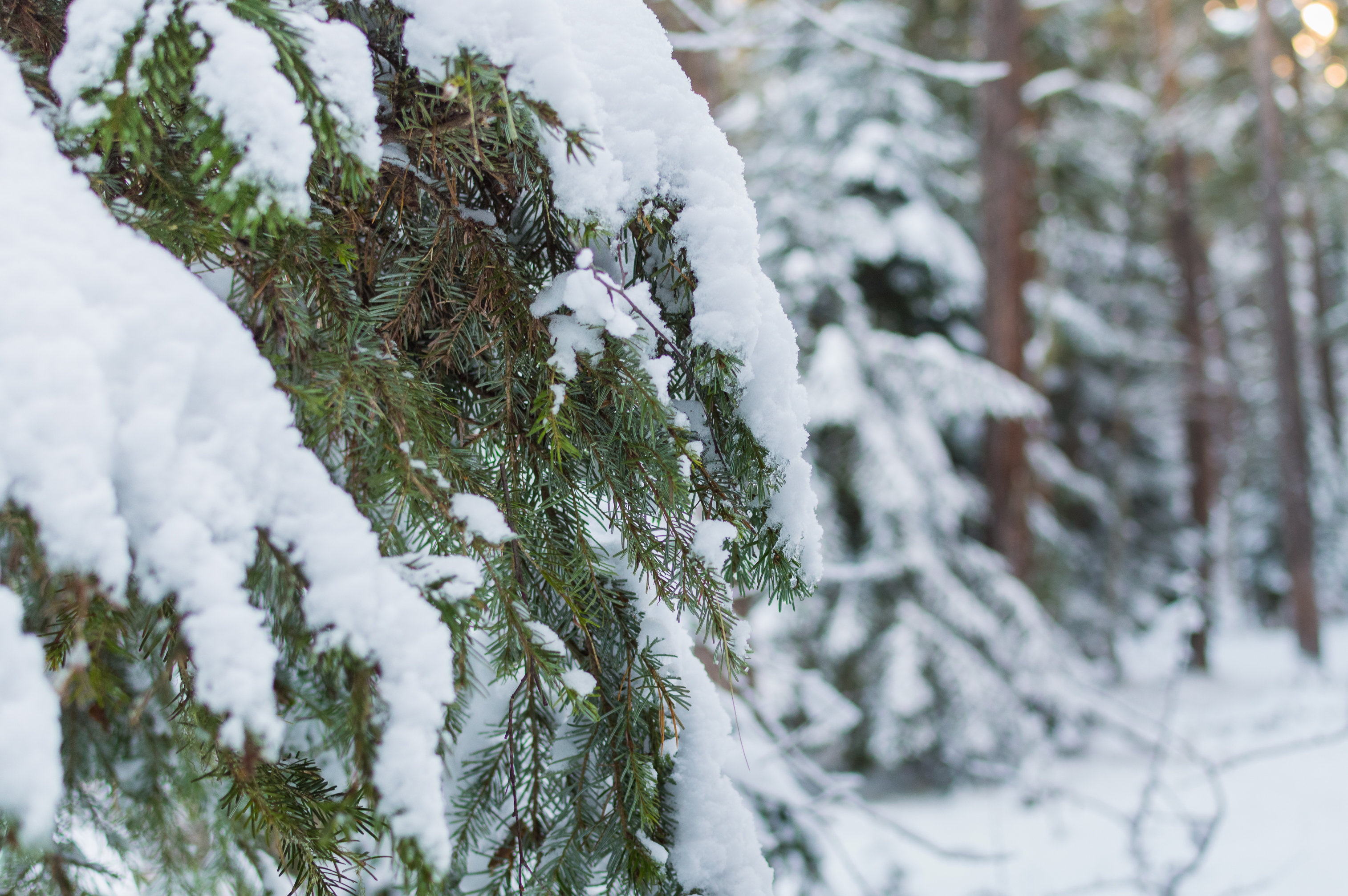 Зимний лес: еловая ветка под снегом, умиротворение природы