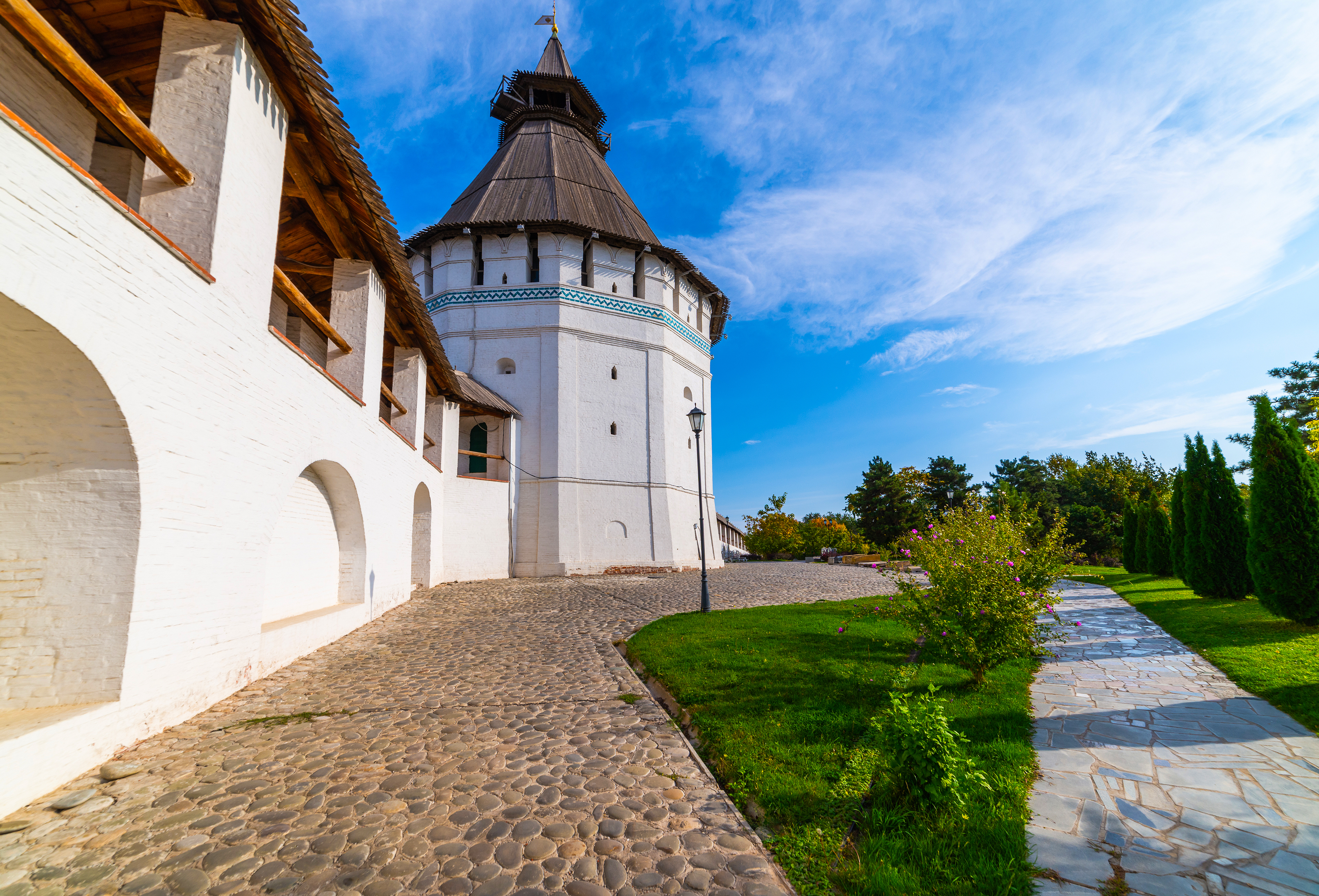 Белая каменная стена двора с большими арками и деревянной крышей вдоль дороги с кладкой в пасмурную погоду с синими облаками. Историко-архитектурный комплекс Астраханский кремль, Россия.