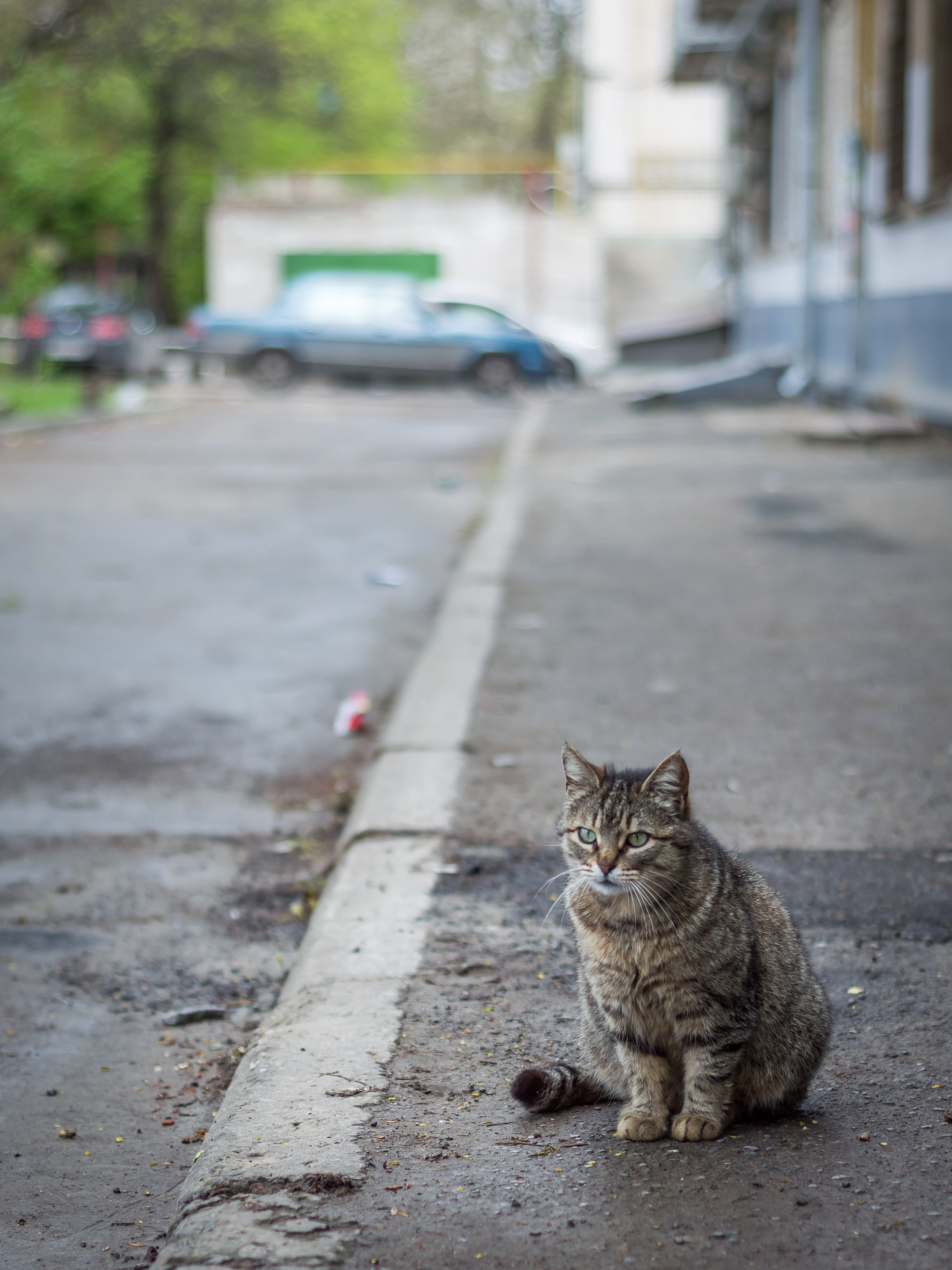 На фотографии запечатлен момент из жизни городского обитателя – полосатого кота, который спокойно сидит на мокром асфальте у края дороги. Его взгляд направлен вдаль, словно он наблюдает за чем-то, происходящим в городской суете, или погружен в свои кошачьи размышления. Зеленые глаза животного выразительны и проницательны, они притягивают внимание зрителя.