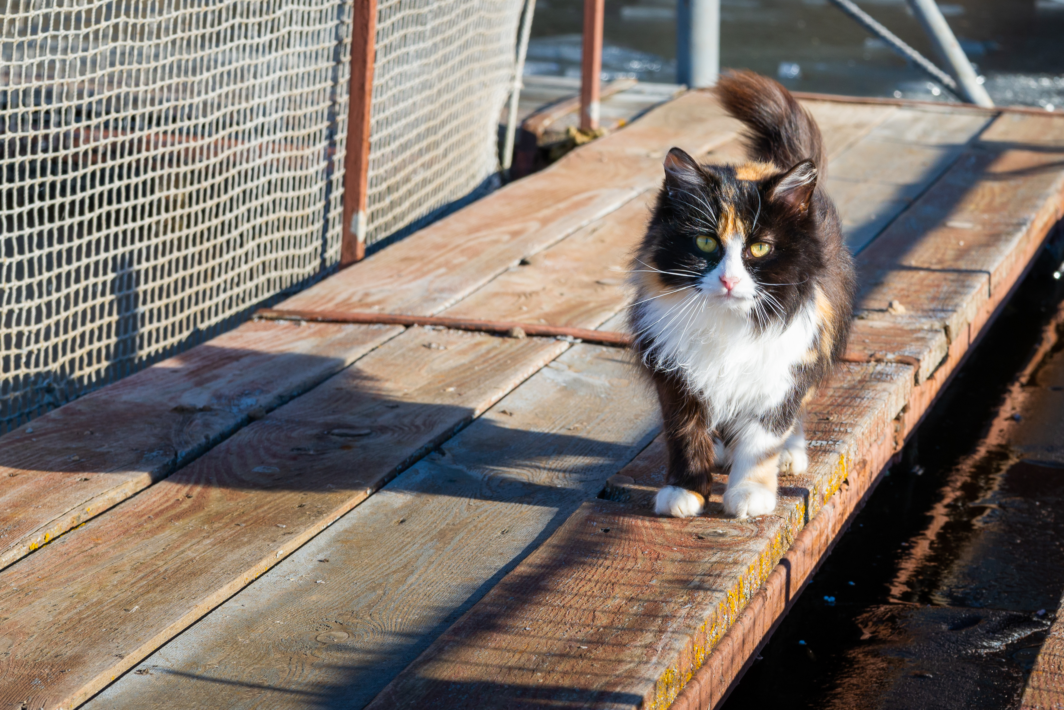 На этом ярком и атмосферном снимке запечатлена очаровательная трехцветная кошка, уверенно шагающая по старому деревянному настилу. Ее шерсть, сочетающая в себе оттенки черного, рыжего и белого, выглядит особенно пушистой и мягкой, что придает ей величественный вид. Яркие солнечные лучи освещают сцену, создавая контрастные тени на досках, подчеркивая текстуру дерева и придавая изображению глубину.