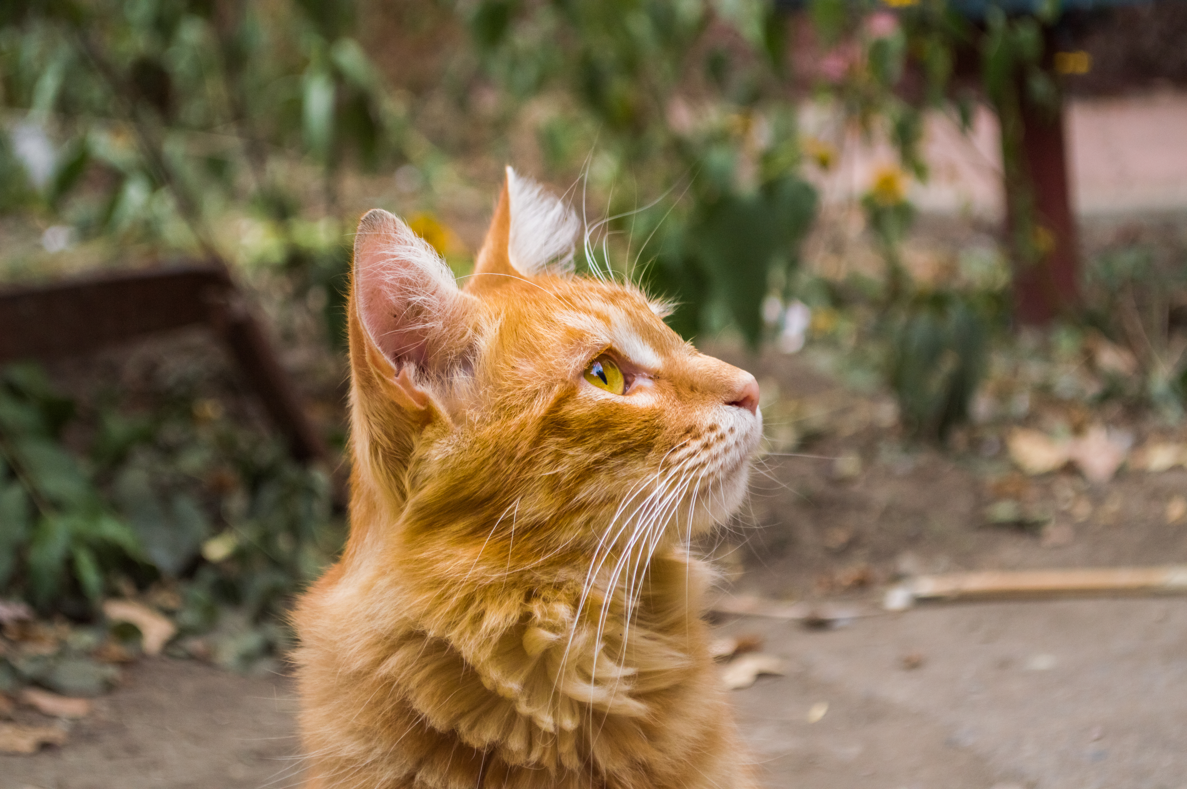 This portrait captures a charming ginger cat, whose amber eyes are fixed in the distance, as if observing something hidden from our view.