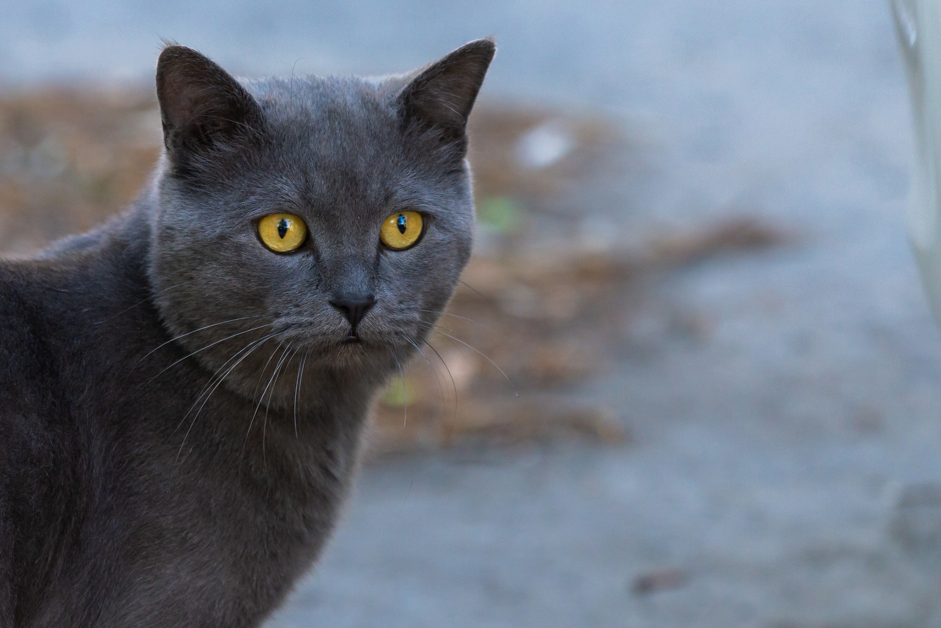 Portrait of a British Shorthair cat with piercing yellow eyes