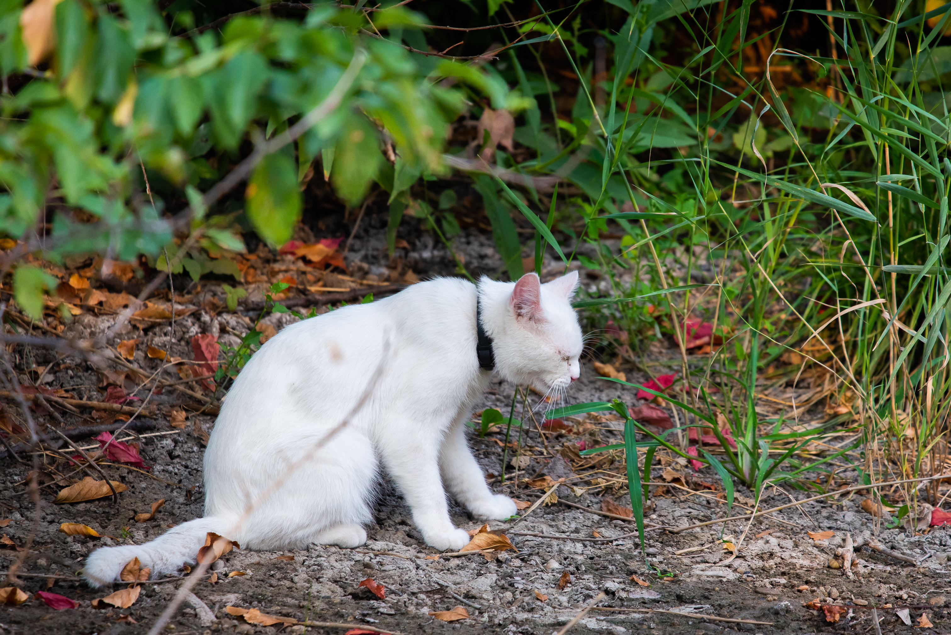 Этот снимок запечатлел момент уединения и исследования дикой природы белым котом. Пушистый питомец, одетый в черный ошейник, склонился к земле, его взгляд сосредоточен на чем-то неуловимом в траве. Его белоснежная шерсть контрастирует с темными оттенками почвы и опавшими осенними листьями, создавая живописную картину.