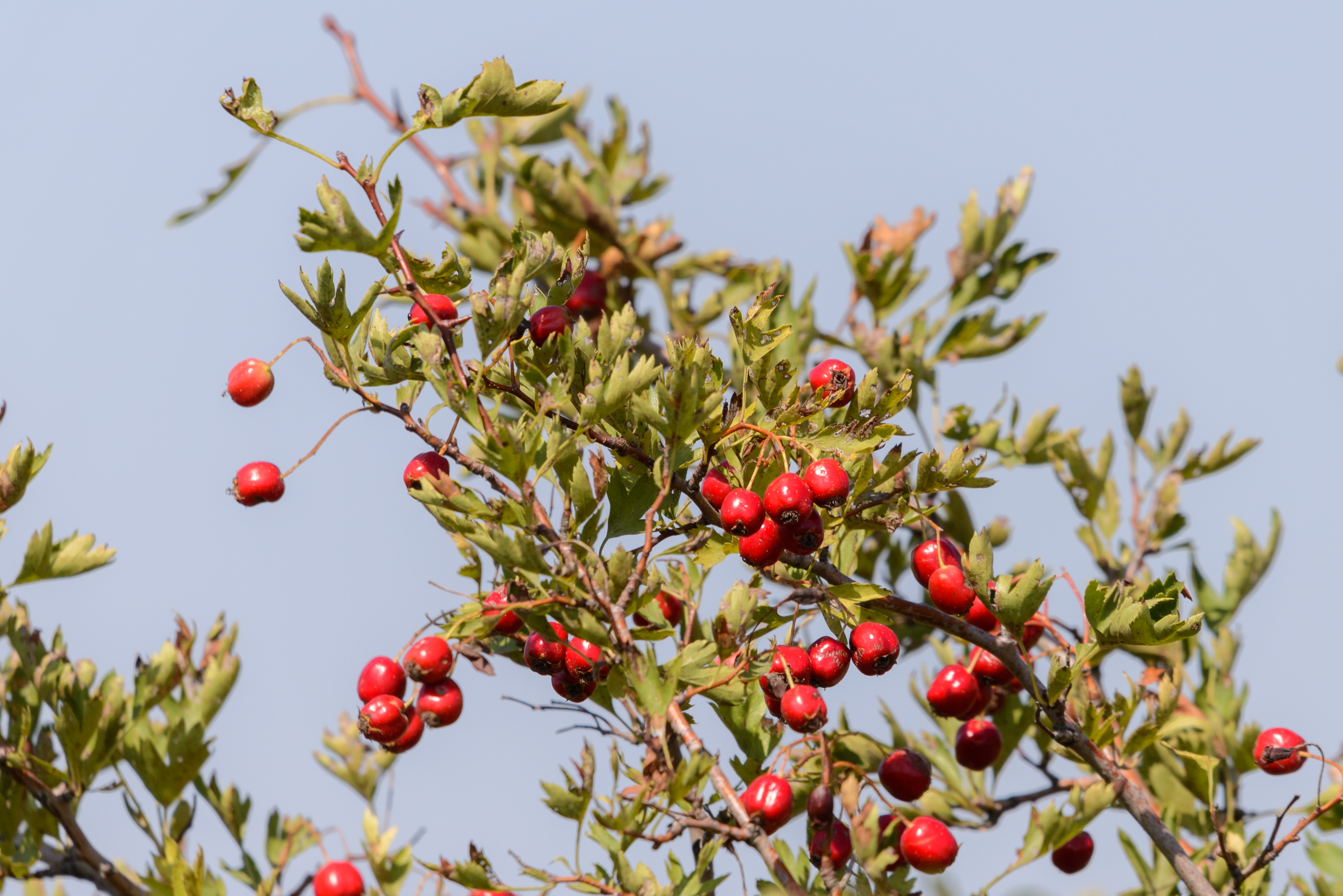 Боярышник. Красные ягоды на ветке дерева.