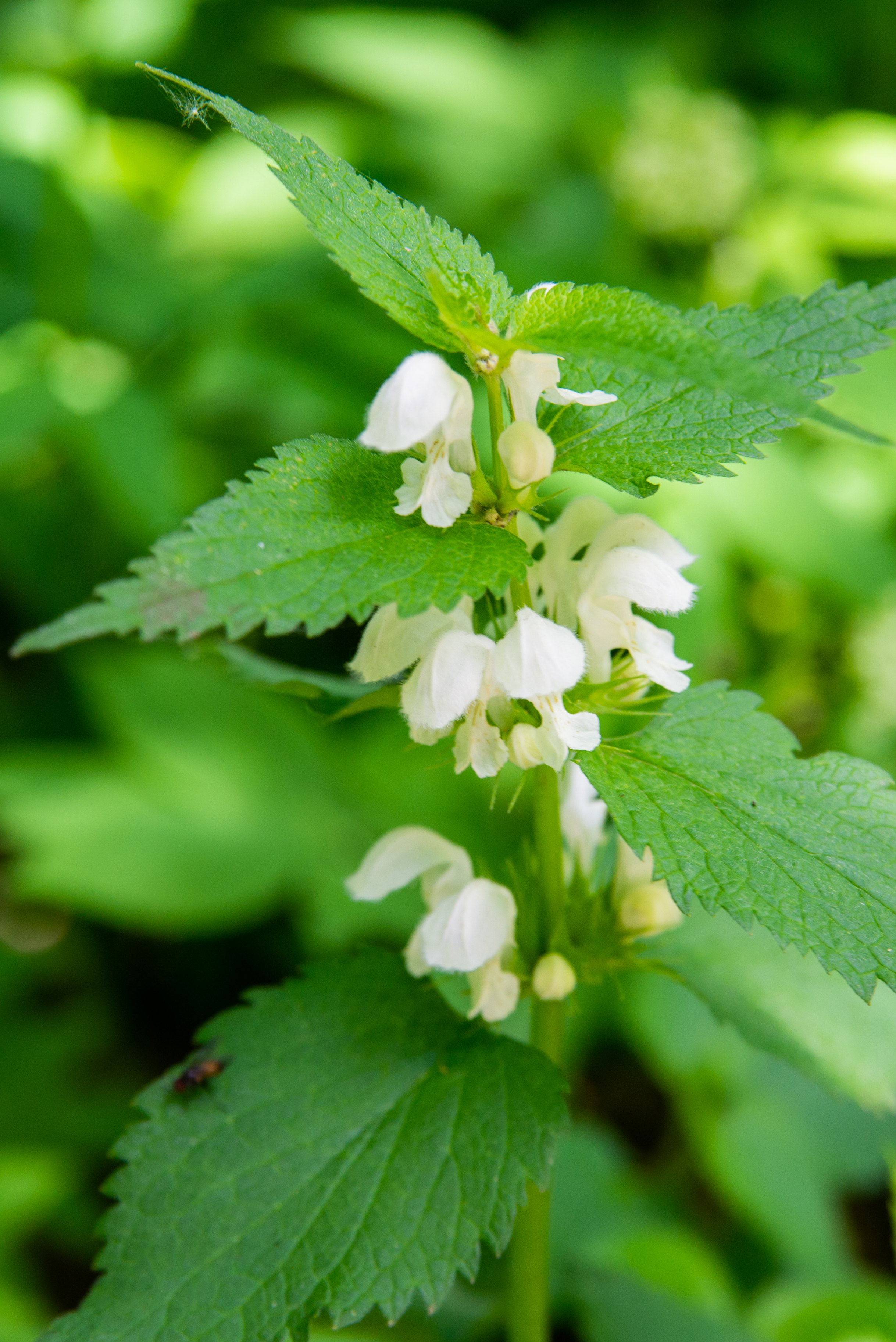 Белая крапива, или яснотка белая, или Яснотка белая, цветет белыми цветами, окруженными зеленой растительностью.