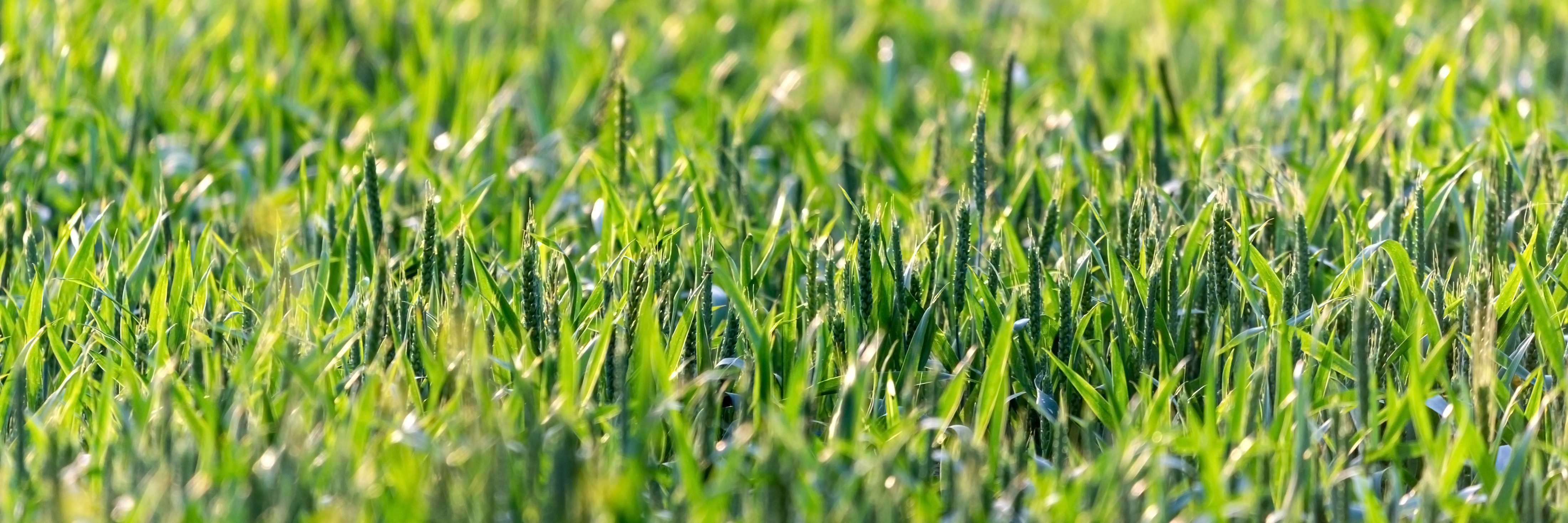 Макросъемка густого поля молодого зеленого зерна, освещенного мягкими лучами восходящего солнца. Идеально подходит для тем, связанных с сельским хозяйством, природой и началом нового дня.