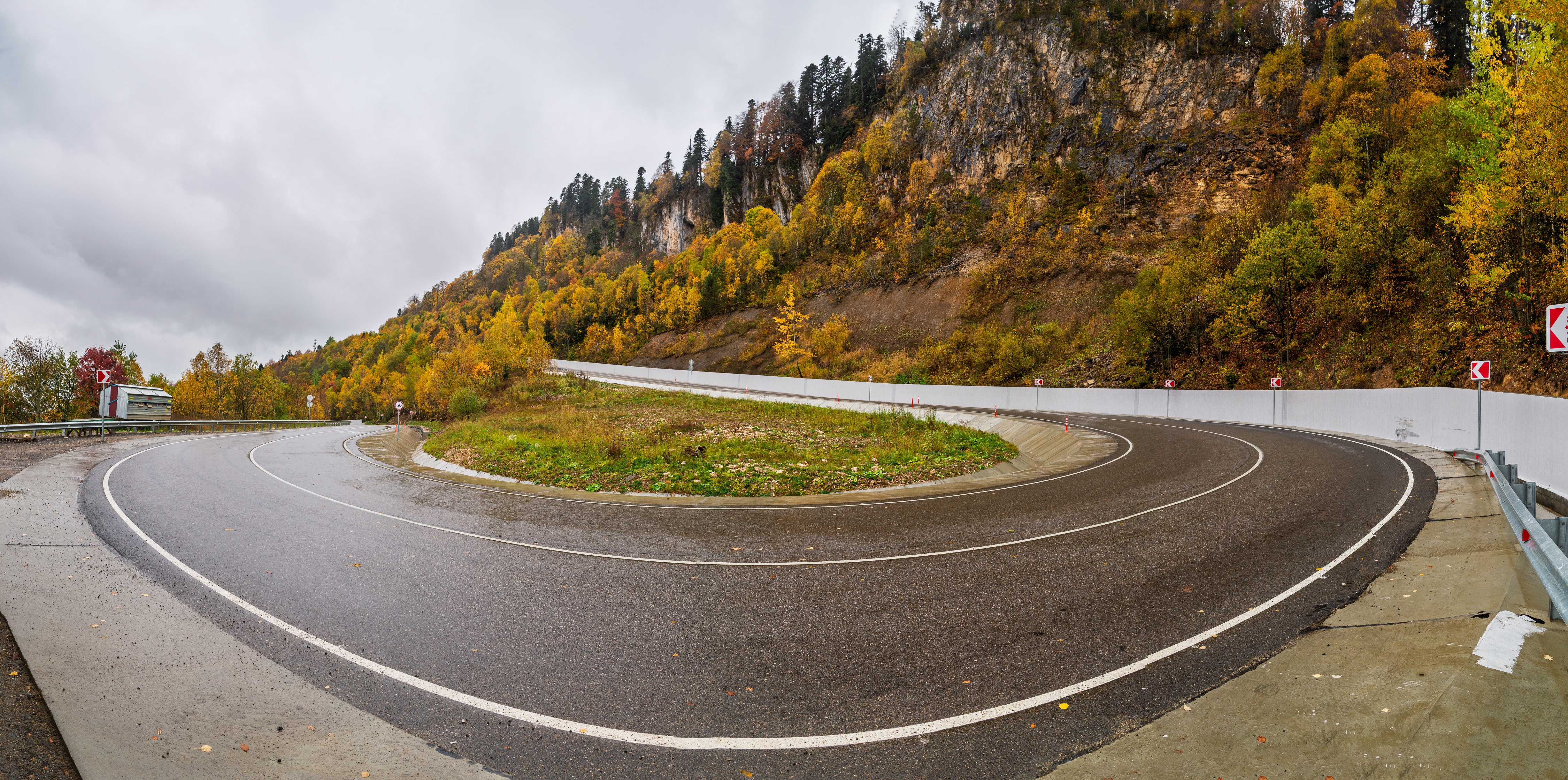 Панорамный вид на извилистую дорогу в горах осенью, с яркими красками деревьев на склоне. Идеально для тем путешествий и природы.