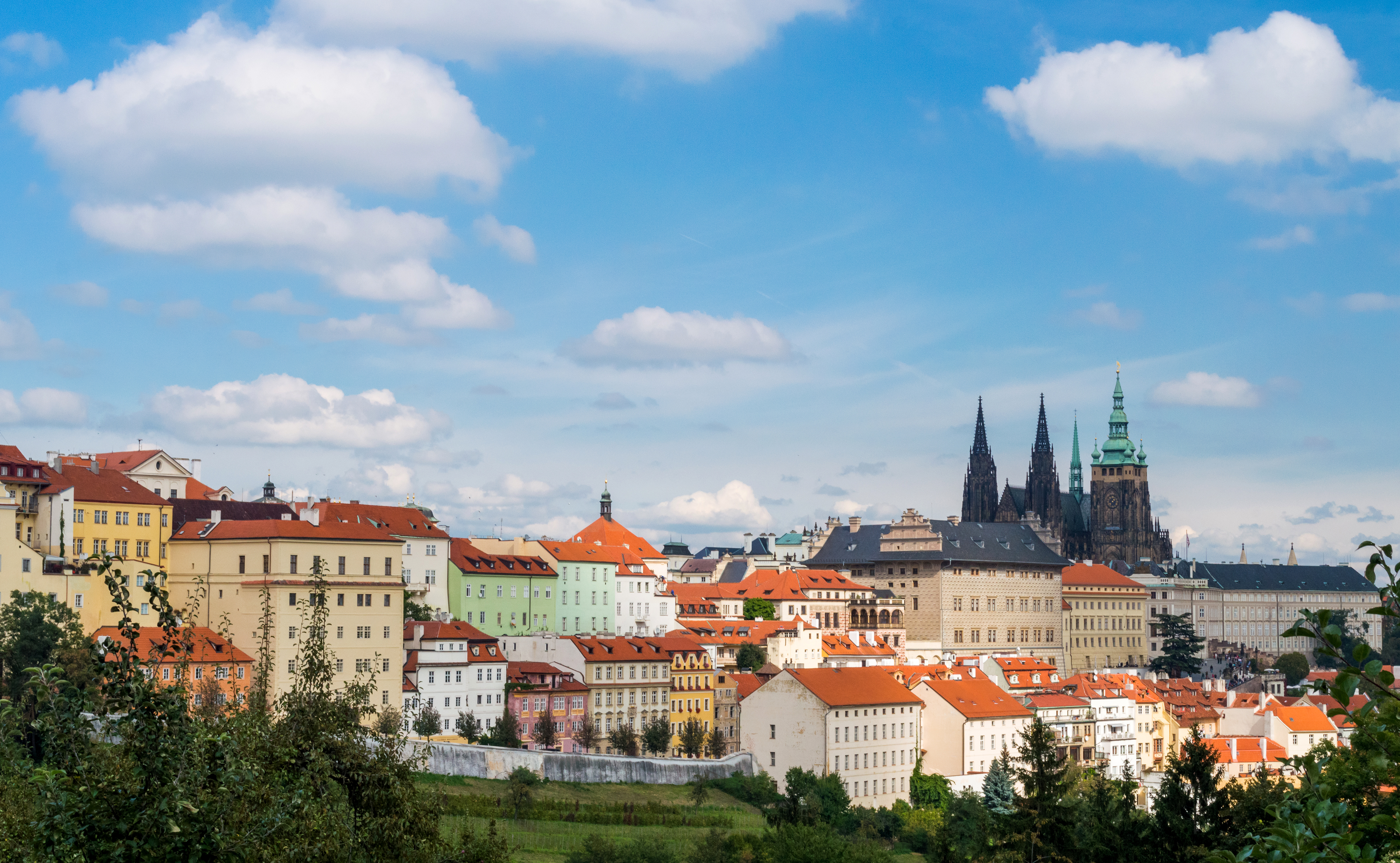 Пражский Град и собор Святого Вита, Чехия. Панорамный вид из парка на холме.