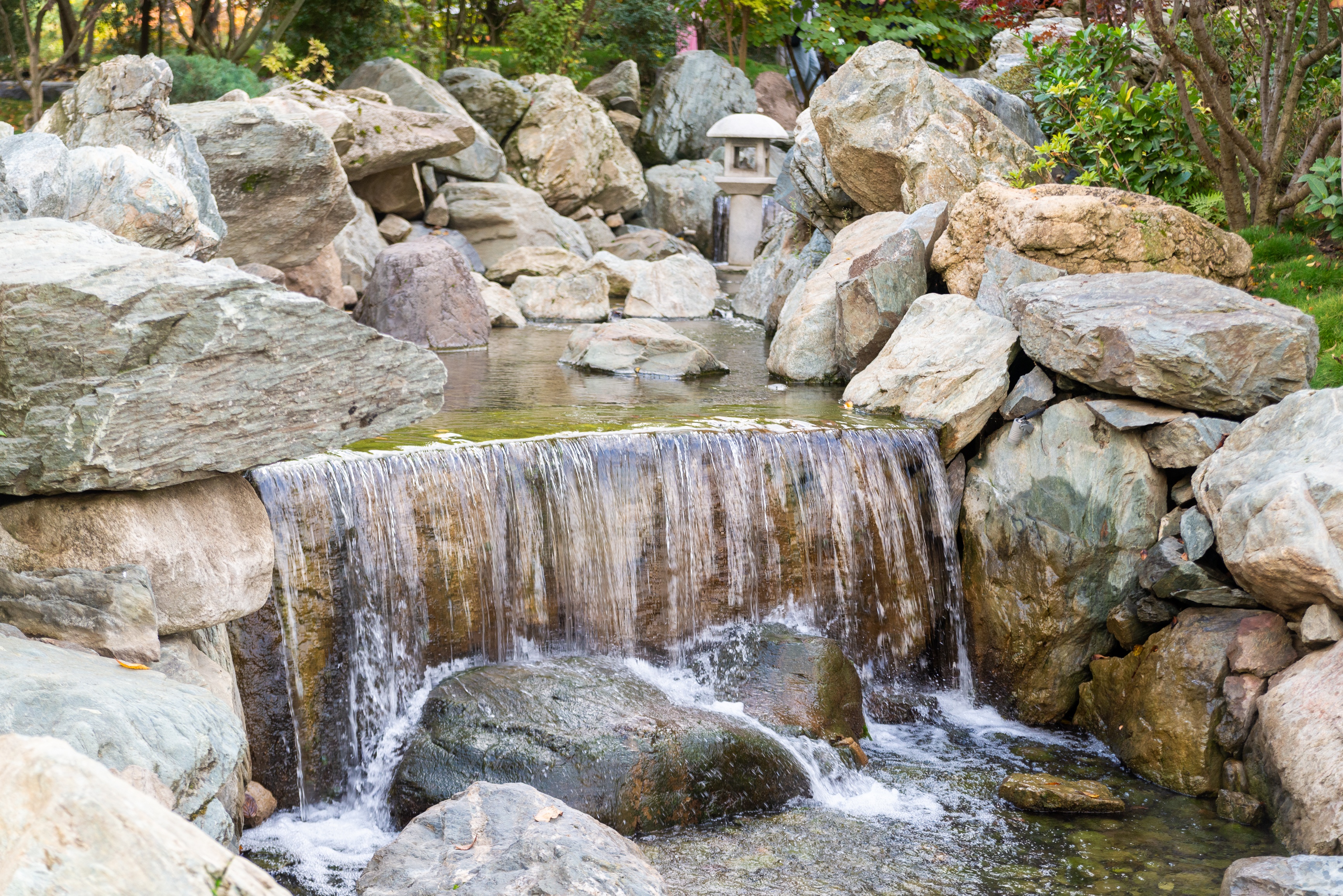 A beautiful man-made waterfall cascades over rocks in the serene Japanese garden section of Galitsky Park in Krasnodar, featuring a traditional stone