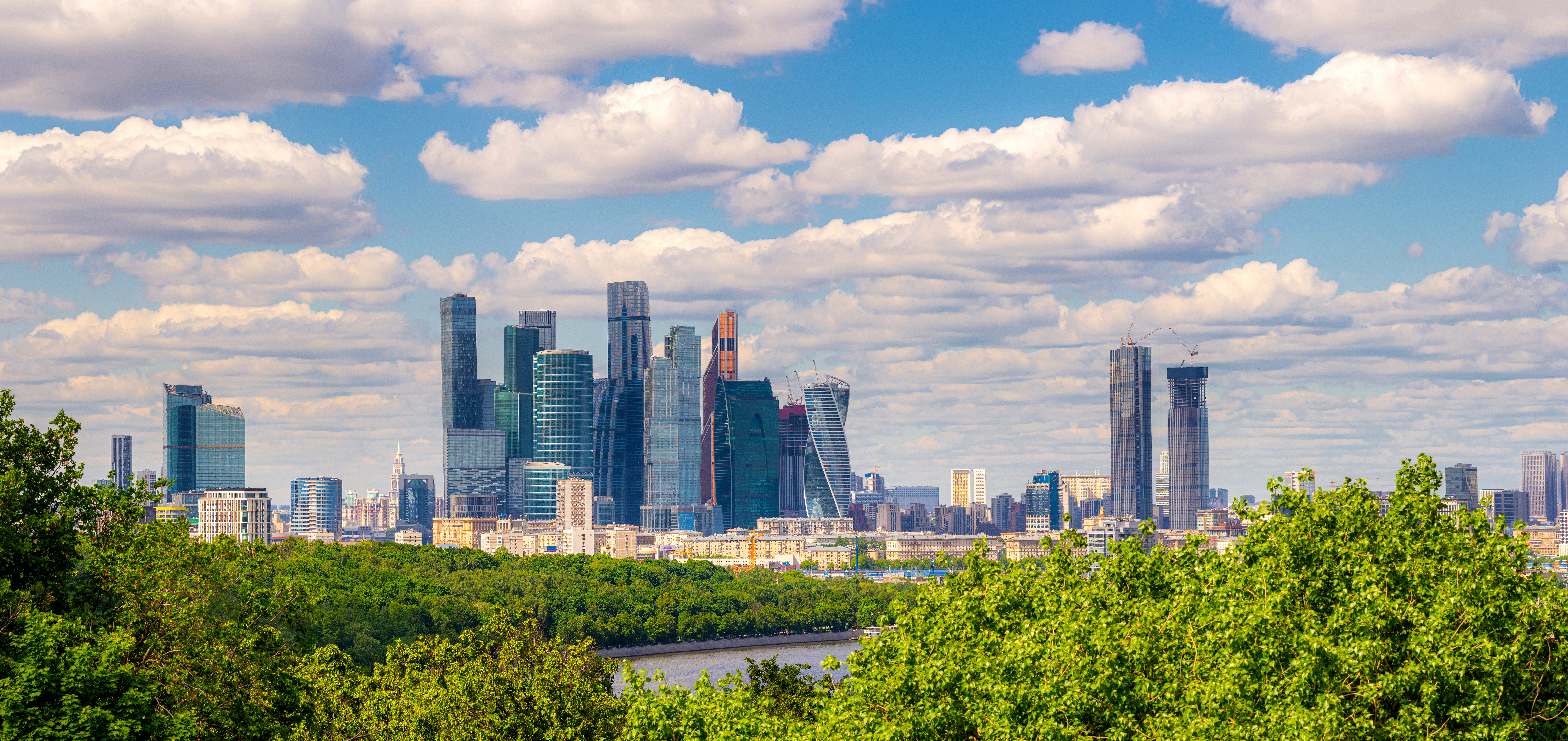 Panoramic view of the Moscow City business center from Sparrow Hills on a summer day. The frame features modern skyscrapers, a green area, and a blue sky with clouds, creating a picturesque landscape.