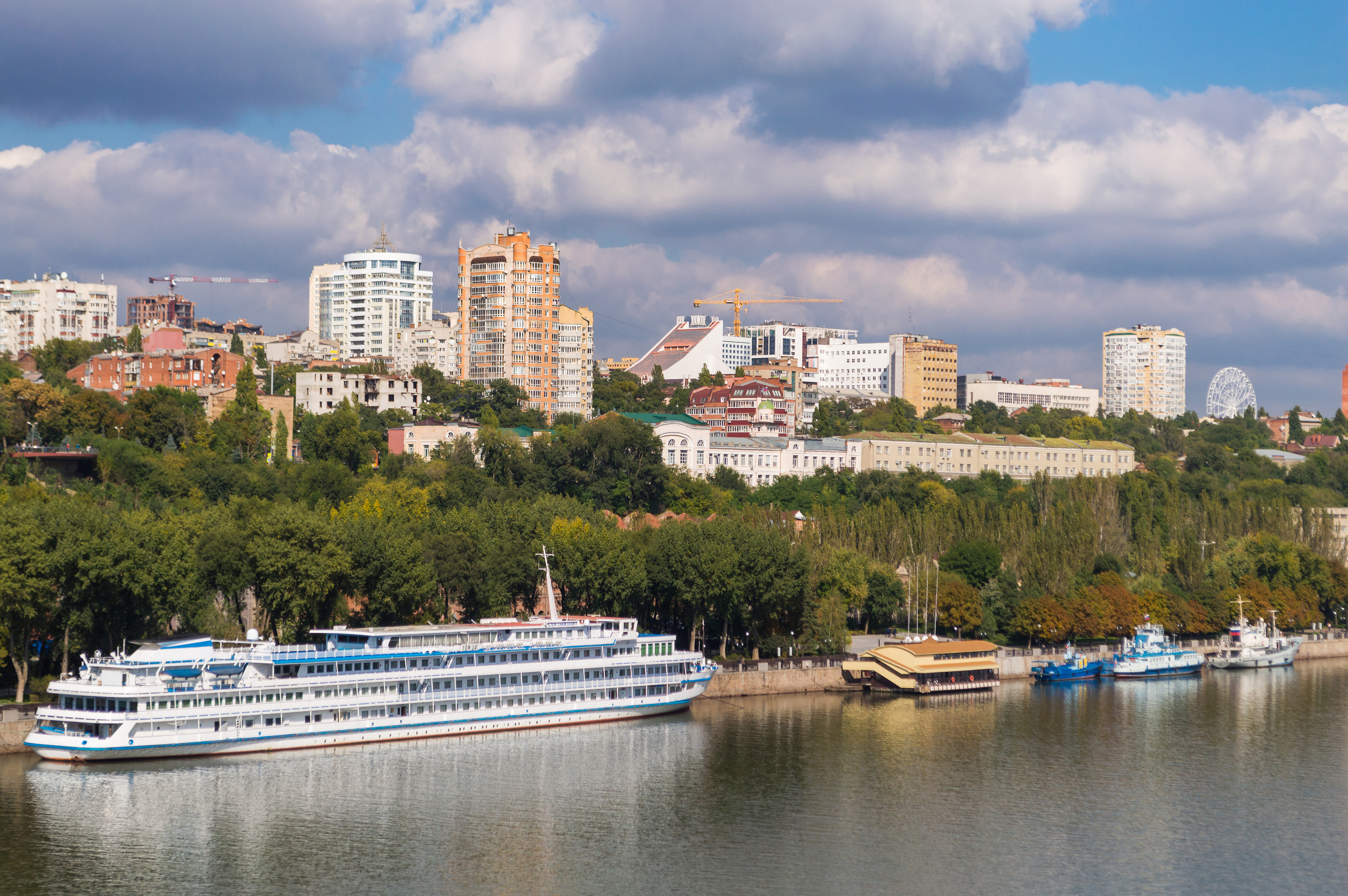 Cruise ship moored to the embankment in Rostov-on-Don, South Russia. Against the background of the panorama of the city on seven hills. View from the Voroshilovskiy bridge.