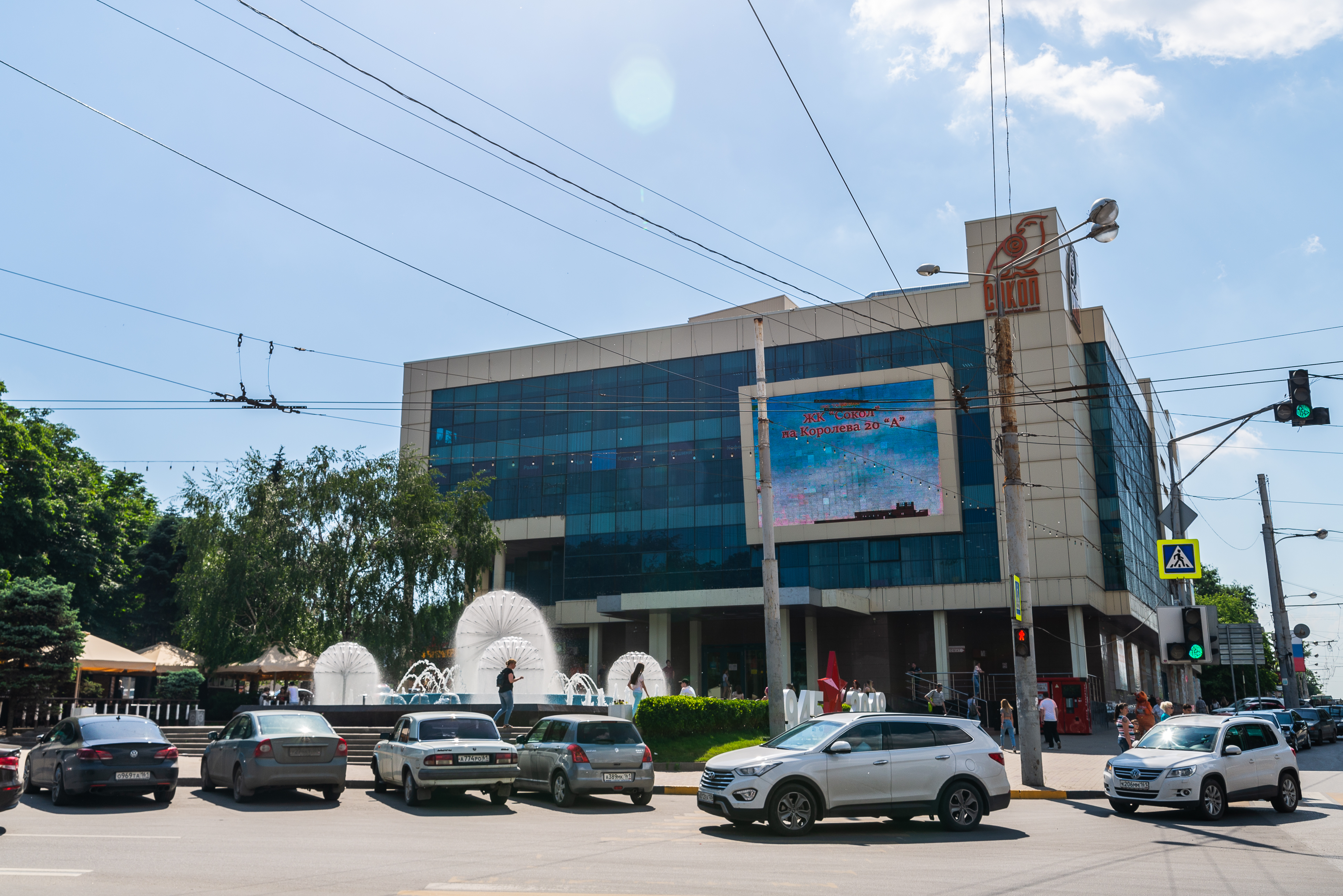 The photograph conveys the atmosphere of a lively urban space, where modern infrastructure harmoniously combines with landscaping elements. This is a place where residents and visitors of the city can spend time shopping, watching movies, or simply relaxing by the fountain. Details are clearly visible in the image: power lines, streetlights, road signs, and traffic lights, which create a complete picture of the shooting location. The Sokol building is a landmark object in Rostov-on-Don, attracting attention with its architecture and multifunctionality.