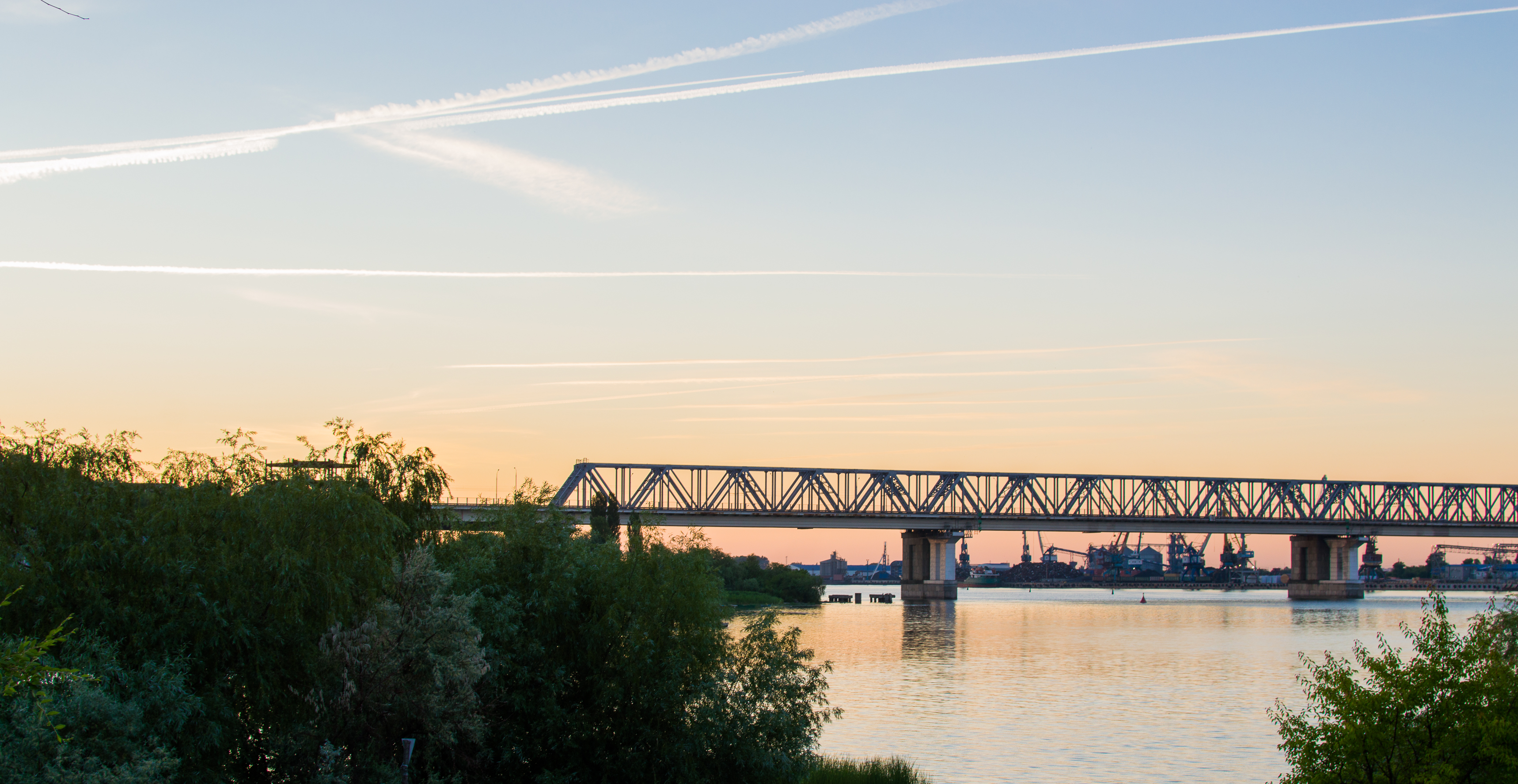 Sunrise over the river. Bridge over river Don. Rostov region.