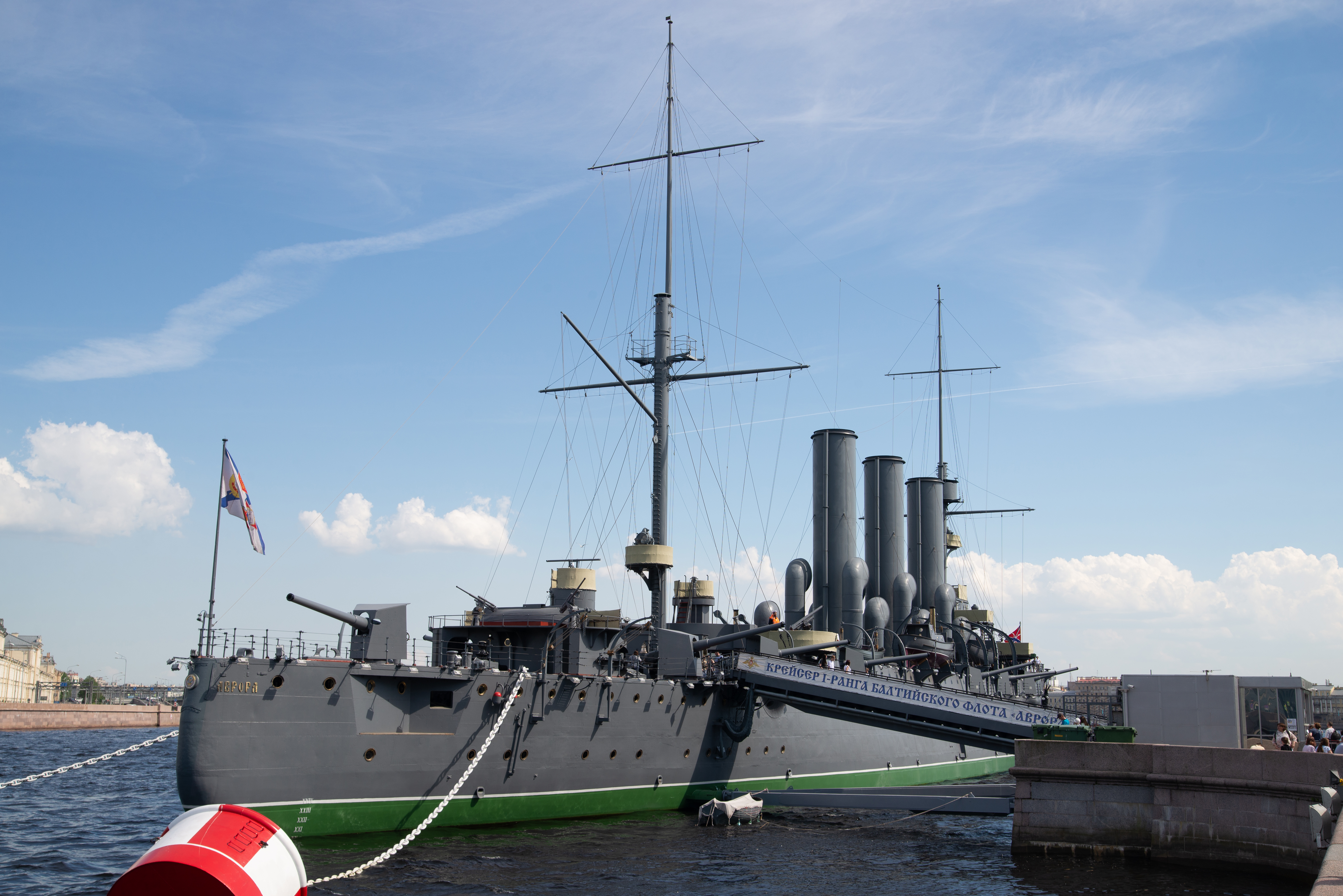 The lighting in the photograph is natural, sunny, it gently falls on the ship's hull, highlighting its relief and details. Shadows from the masts and superstructures create a play of light and shadow, giving the image volume and depth. The atmosphere of the shot is calm and majestic, conveying a sense of connection to history, recalling the significant events associated with the cruiser, including its role in the Great October Communist Revolution of 1917. The photograph evokes a feeling of pride in Russia's history and culture.