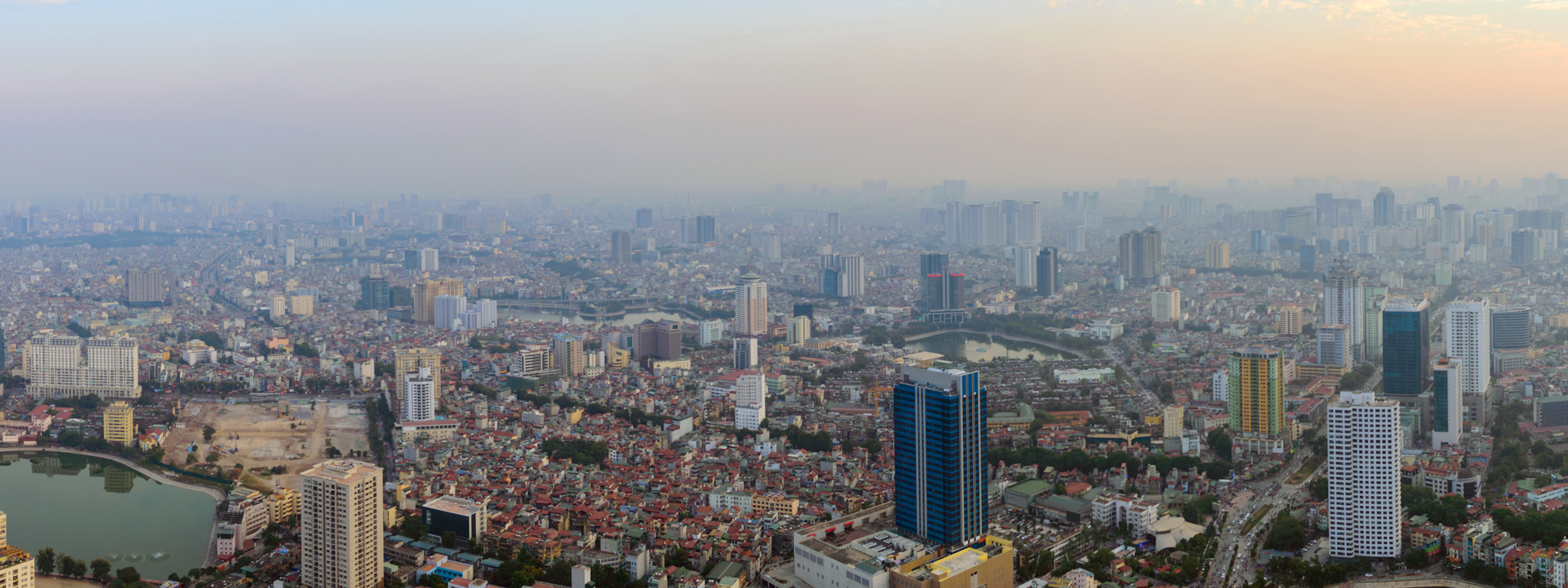 Городской пейзаж Ханоя в сумерках. Загрязнение воздуха в большом городе. Смог в воздухе.
