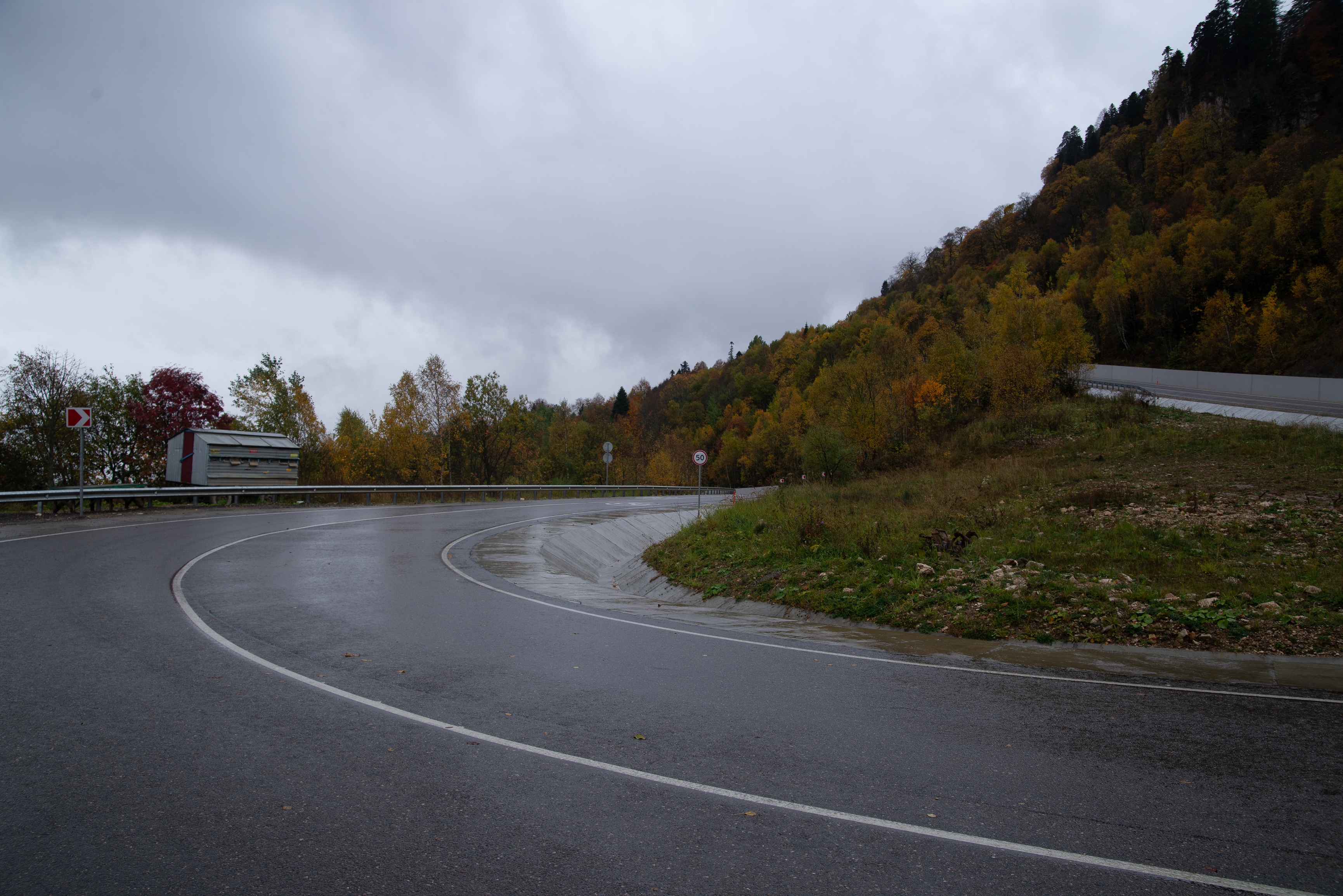 Мокрая, извилистая дорога изгибается сквозь осенний лес в облачный день в Адыгее, демонстрируя яркую осеннюю листву и хмурое небо.