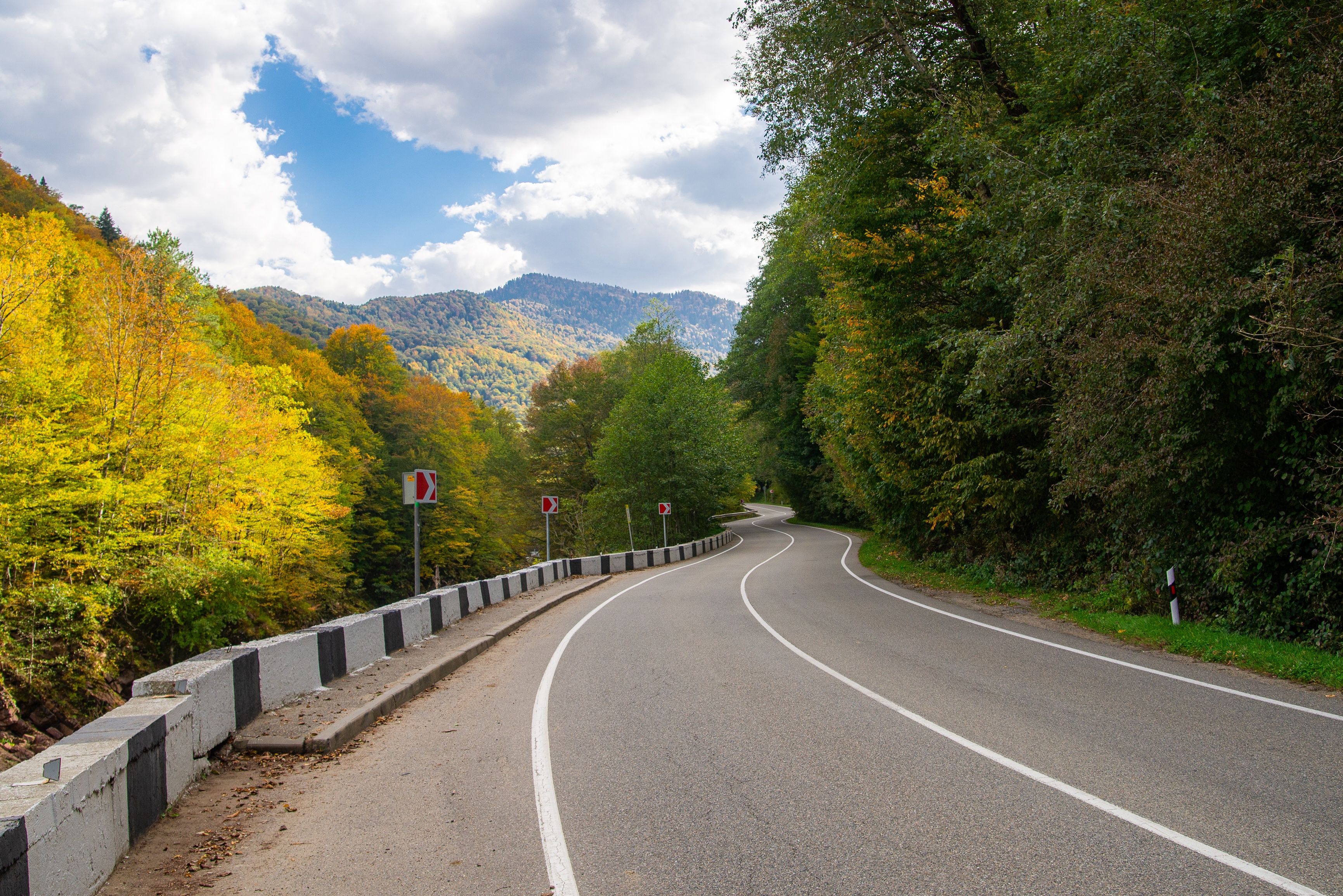 A winding asphalt road curves through a vibrant autumn forest with yellow and green trees under a partly cloudy sky in the mountains of Adygea.