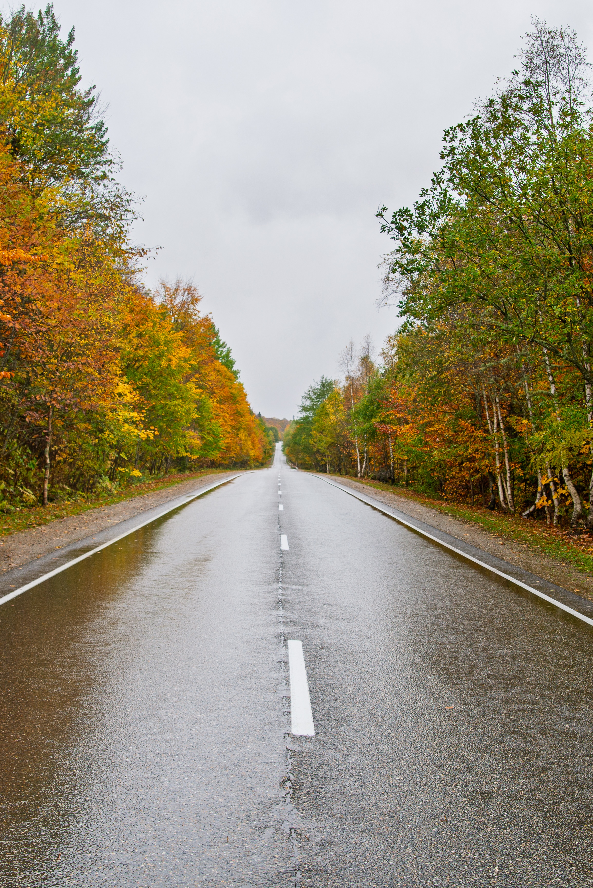 A long, wet asphalt road stretches into the distance, flanked by vibrant autumn trees under a cloudy sky in Adygea.