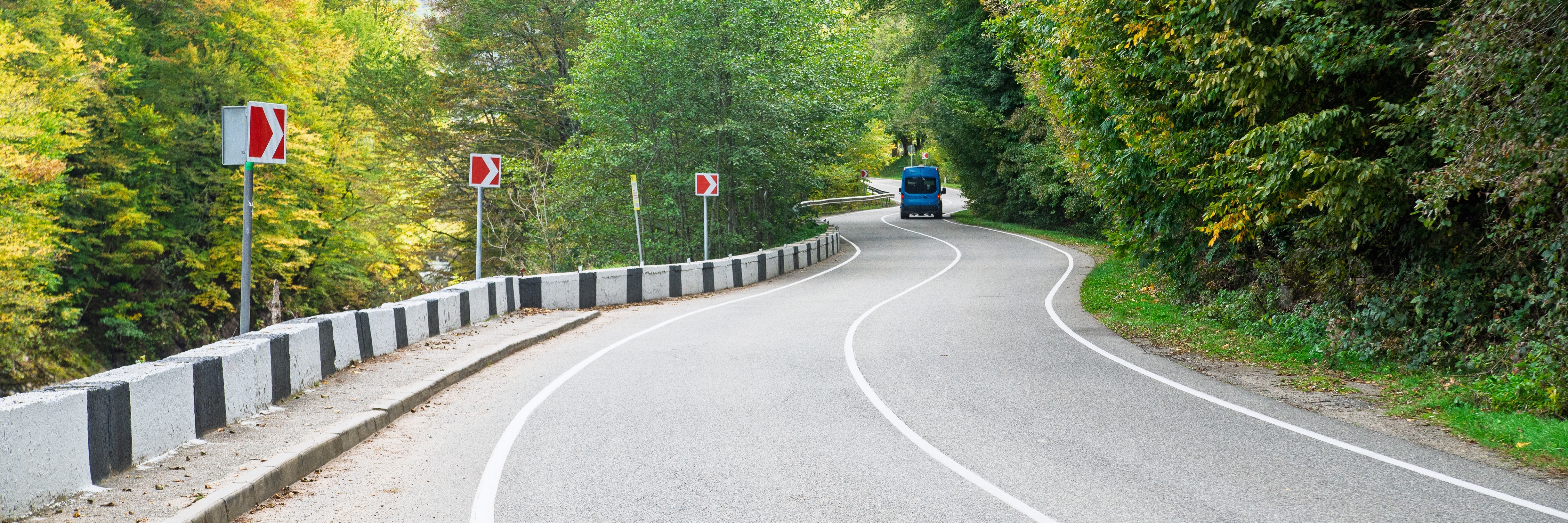 A scenic winding asphalt road with white markings curves through a vibrant green and yellow forest in Adygea, featuring a safety barrier