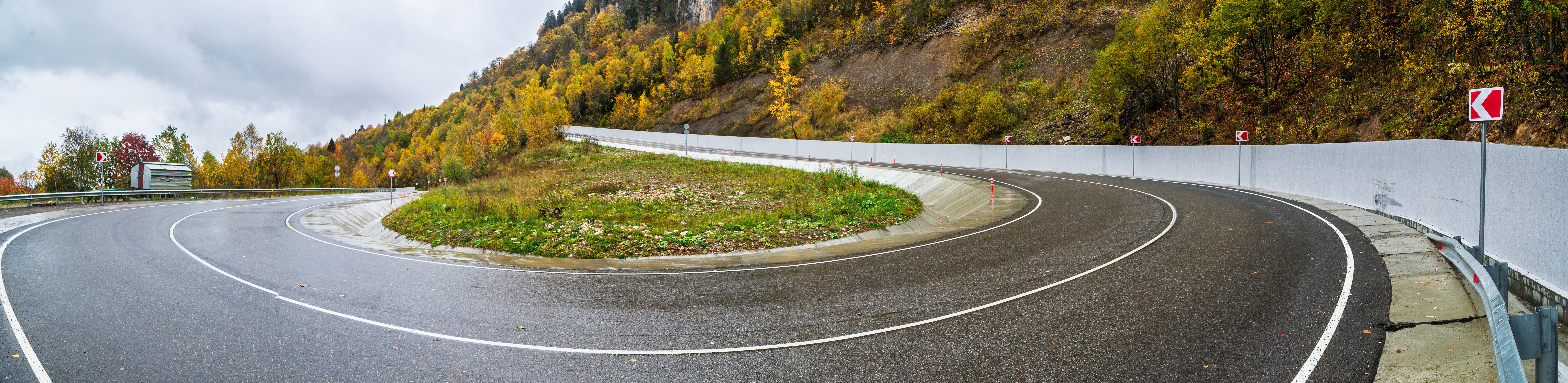 A wide panoramic view captures a wet, winding asphalt road forming a sharp hairpin turn through an Adygea mountain landscape adorned with vibrant