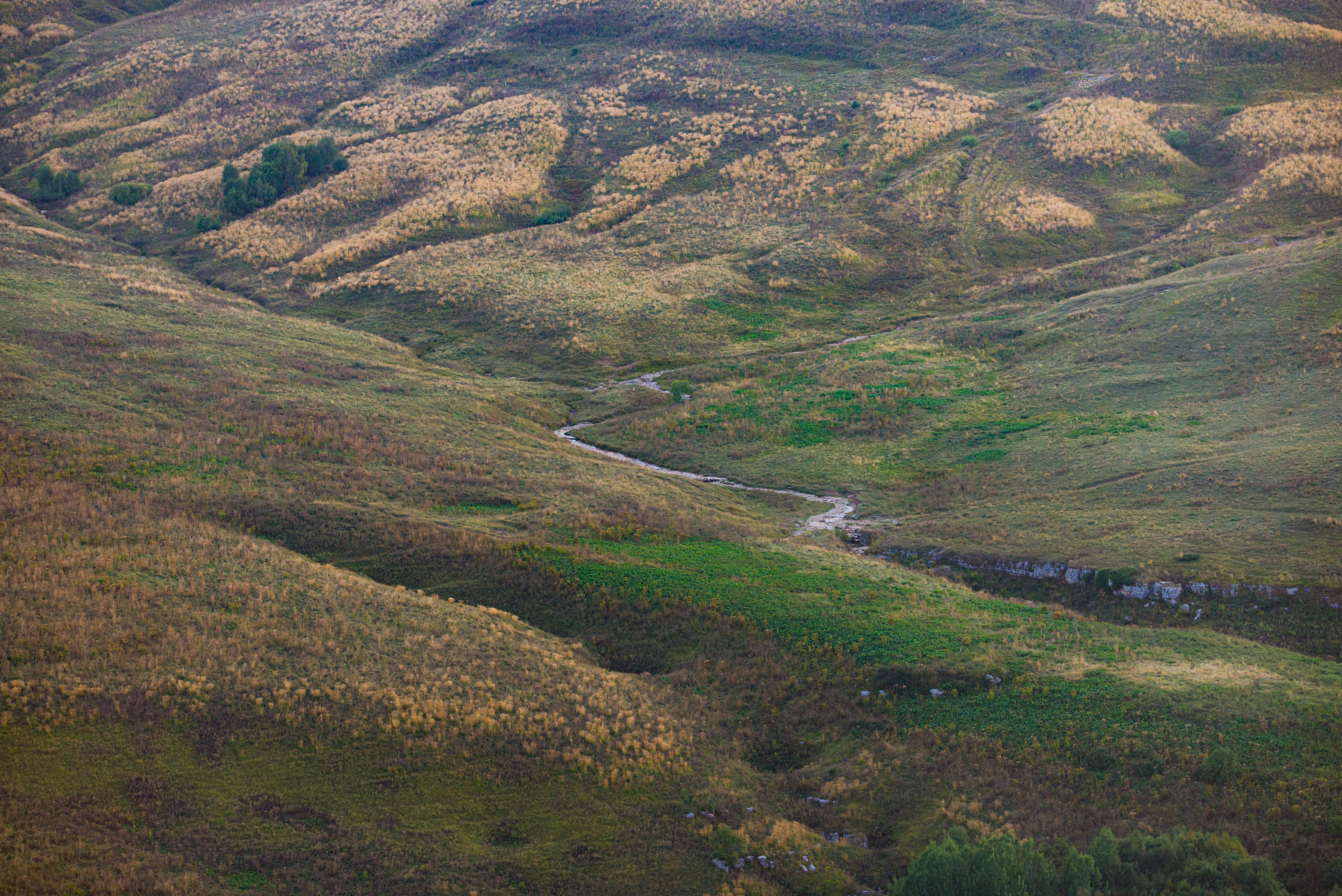 Склоны холмов покрыты густой травой, которая приобретает разнообразные оттенки — от насыщенного изумрудно-зеленого в тенистых низинах до золотисто-желтого на освещенных солнцем участках. Это сочетание цветов создает впечатление богатства природы и игры света и тени.