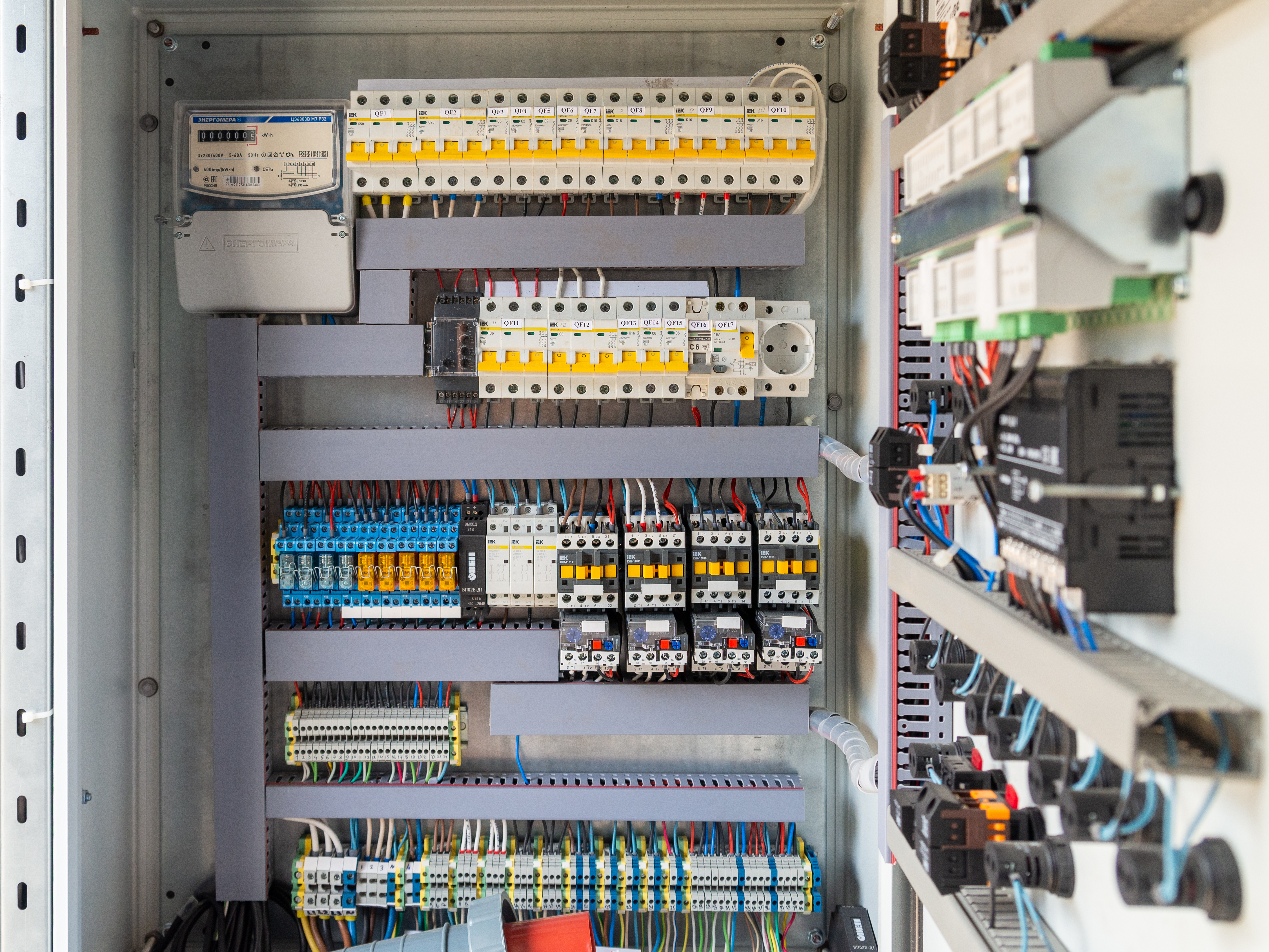 Further across the width of the panel, numerous wires of various colors are visible: blue, red, green, yellow, and black, neatly routed and connected to terminals. These wires are the arteries through which electricity is distributed. Among them, relays and other components ensuring the safe and efficient operation of the system can be spotted.