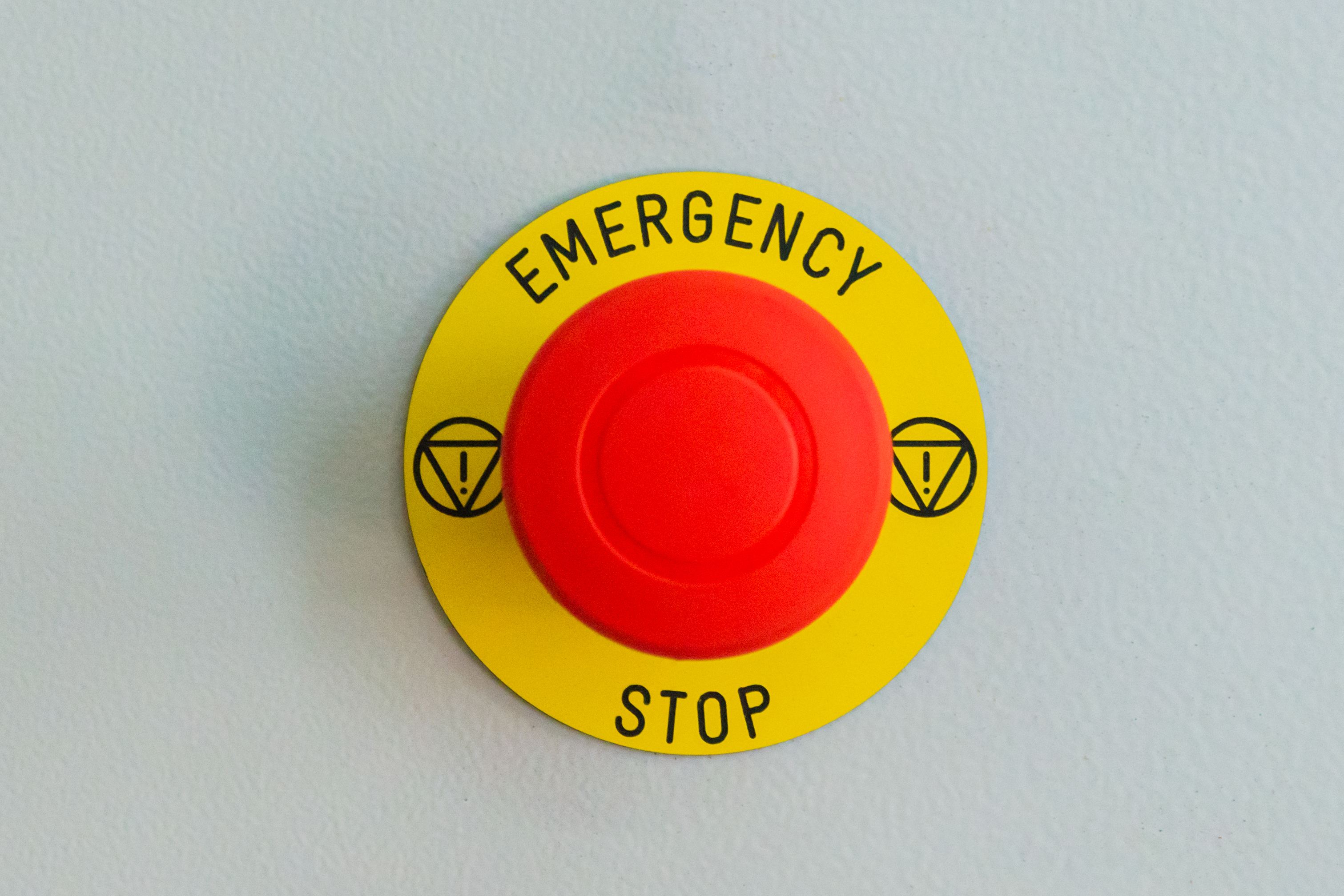 Black symbols are clearly visible on the yellow background surrounding the button. To the left and right of the red button, two identical warning signs are depicted: a triangle with an exclamation mark inside, enclosed within a circle. These symbols serve as universal indicators of potential danger and the need for caution.