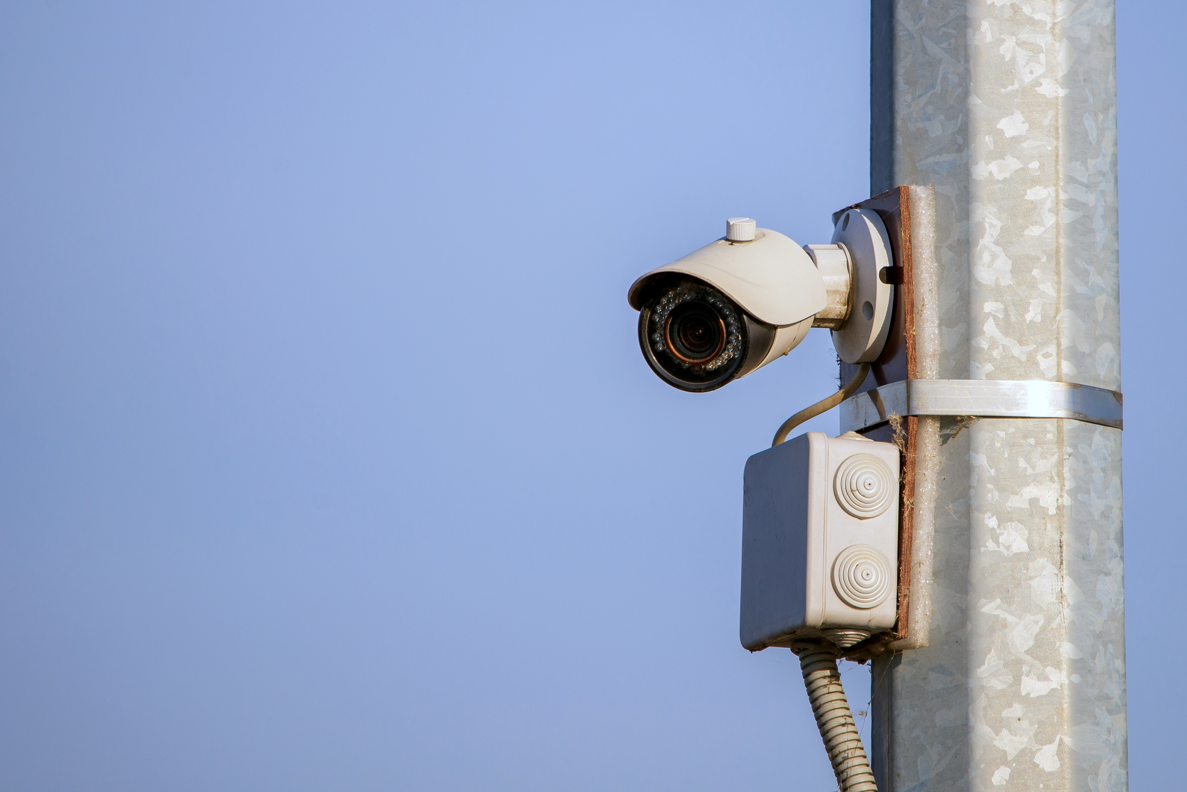 Современная камера видеонаблюдения на фоне неба. Концепция наблюдения и мониторинга.
