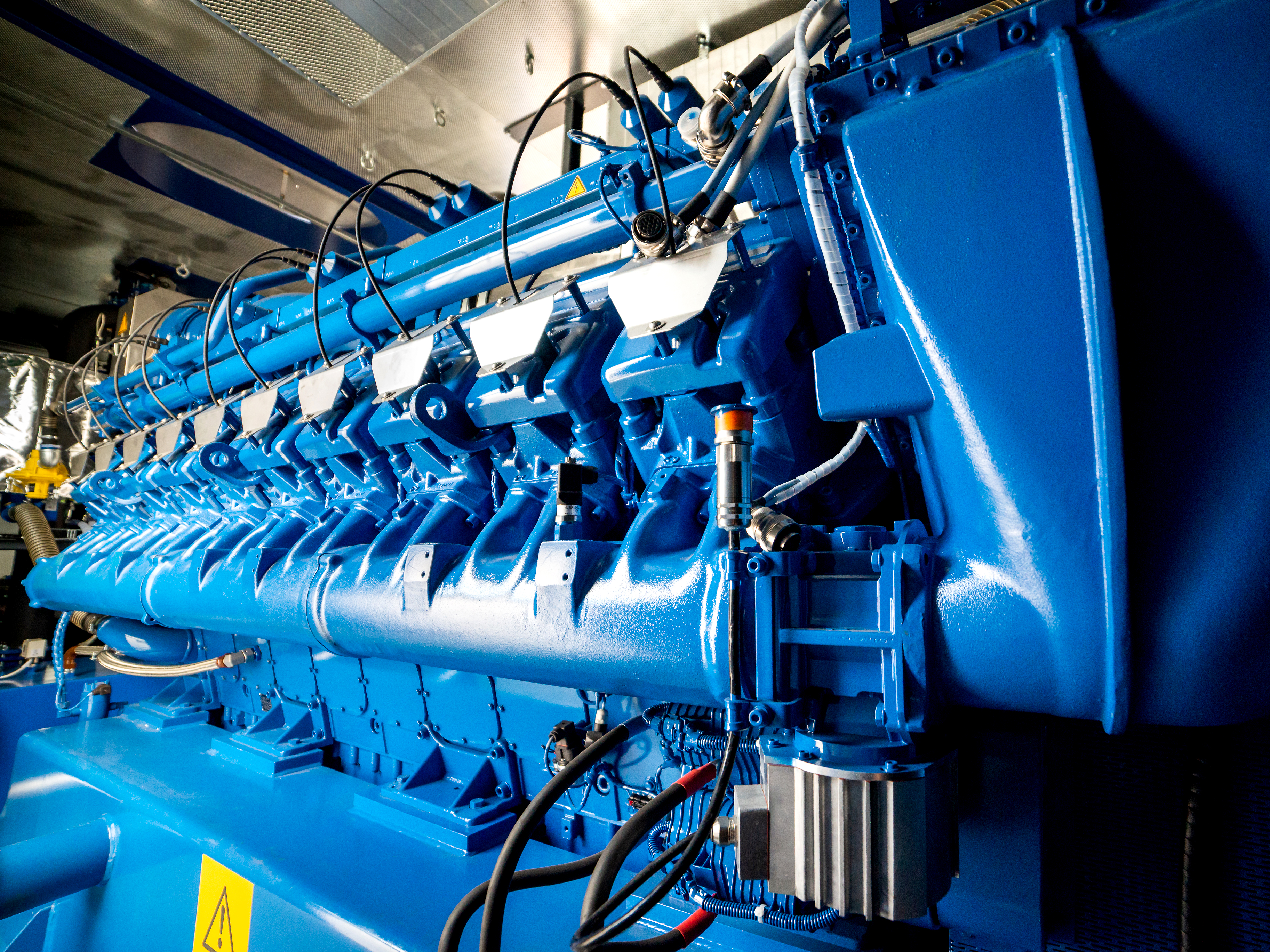Engine of CHP unit. Diesel and gas industrial electric generator. Alternative energy for industry.