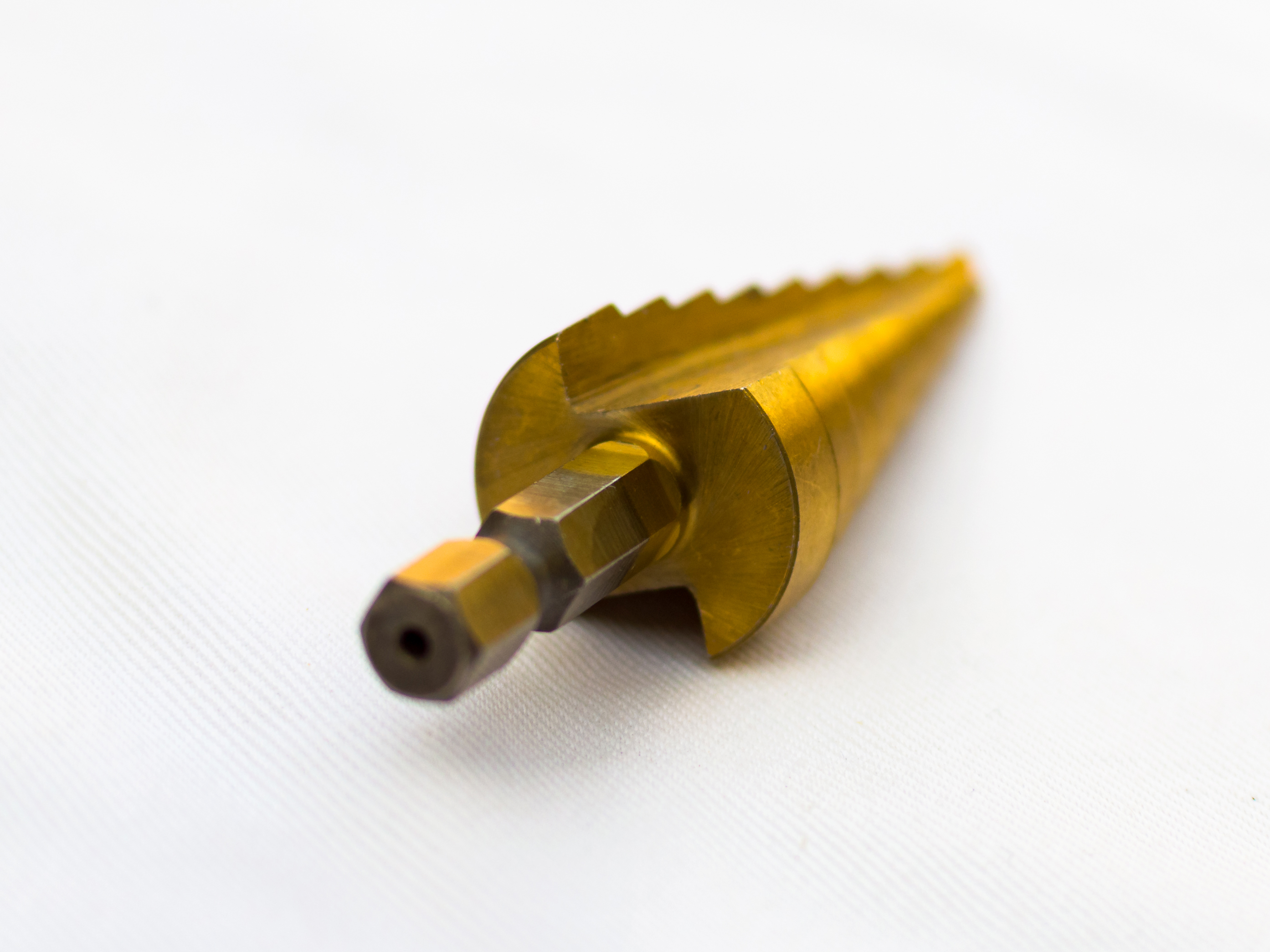 Это изображение демонстрирует высококачественное золотое ступенчатое сверло, расположенное на ровной, текстурированной белой поверхности. Сверло находится в фокусе, его блестящая золотая поверхность отражает свет, подчеркивая его прочность и точность.