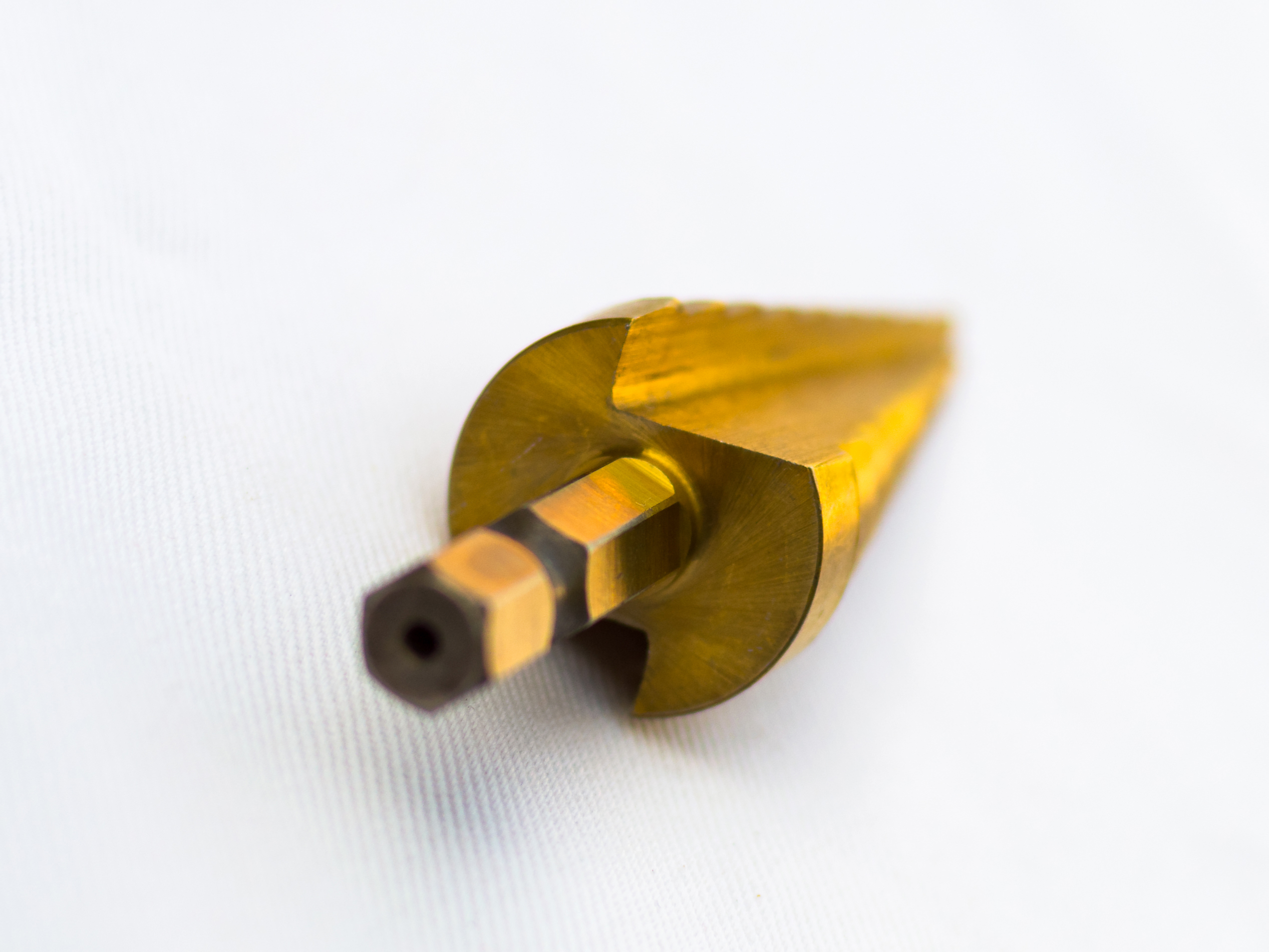 This image presents a detailed macro shot of a step drill bit, rendered in a golden hue. The tool is positioned on a clean, neutral white background, which allows the viewer's full attention to be focused on its shape and texture. The drill bit has a characteristic conical shape with multiple steps, each designed to create holes of different diameters.