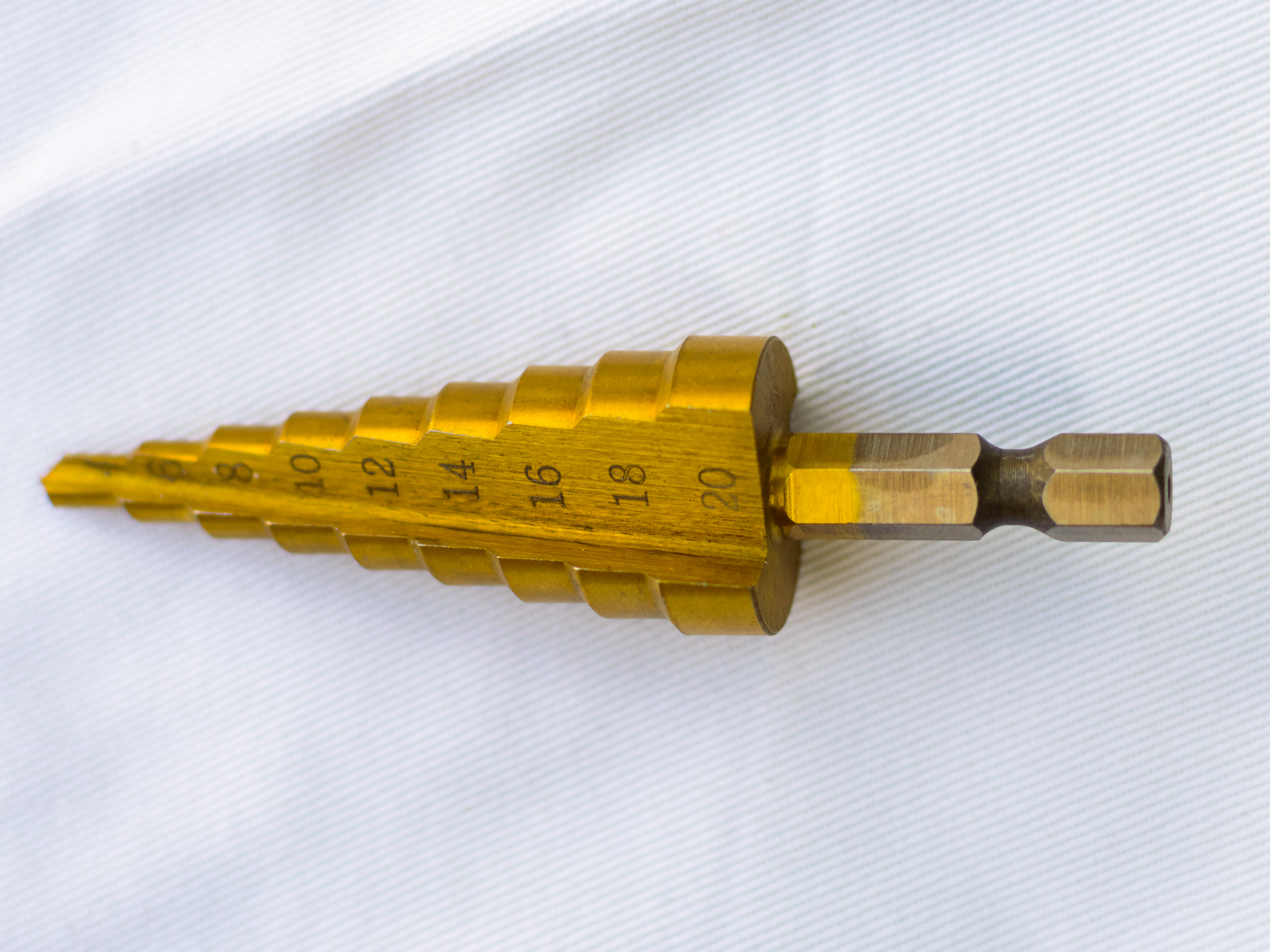 The image showcases a golden step drill bit lying on a white textured surface, resembling fabric. The tool has a conical shape with progressively increasing steps, each marked with a numerical value indicating the drilling diameter. The markings start with smaller numbers at the sharp end and increase up to 20 at the base.