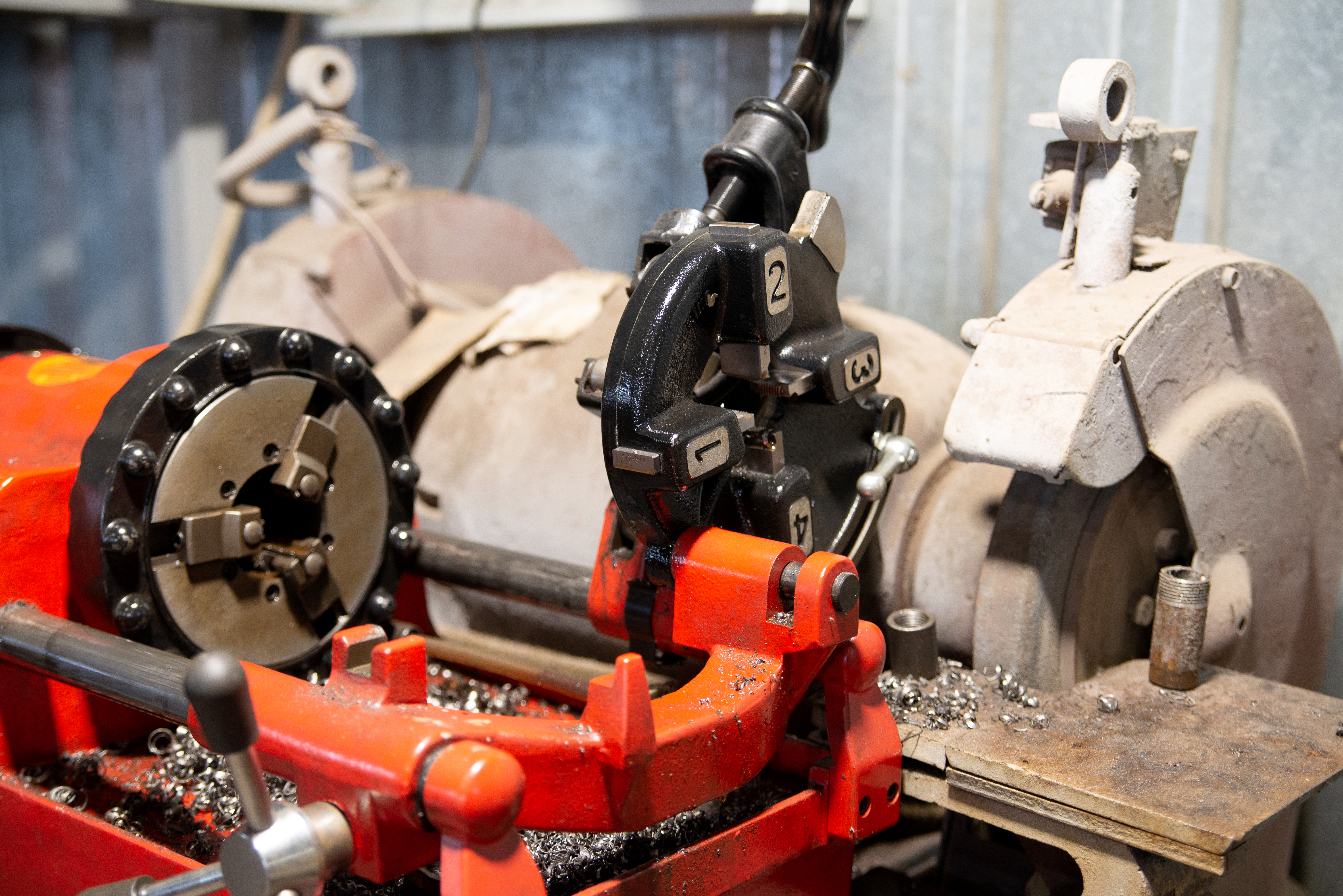 The image immerses the viewer into the atmosphere of a real workshop where work is in full swing. The bright red pipe threading machine dominates the foreground, its massive metal parts visible in detail. The black head marked with numbers from 1 to 4 indicates different operating modes or sizes of threads being cut, demonstrating the precision and mechanical complexity of the tool. Abundant metal shavings are visible around the machine, indicating recent work and the production process.