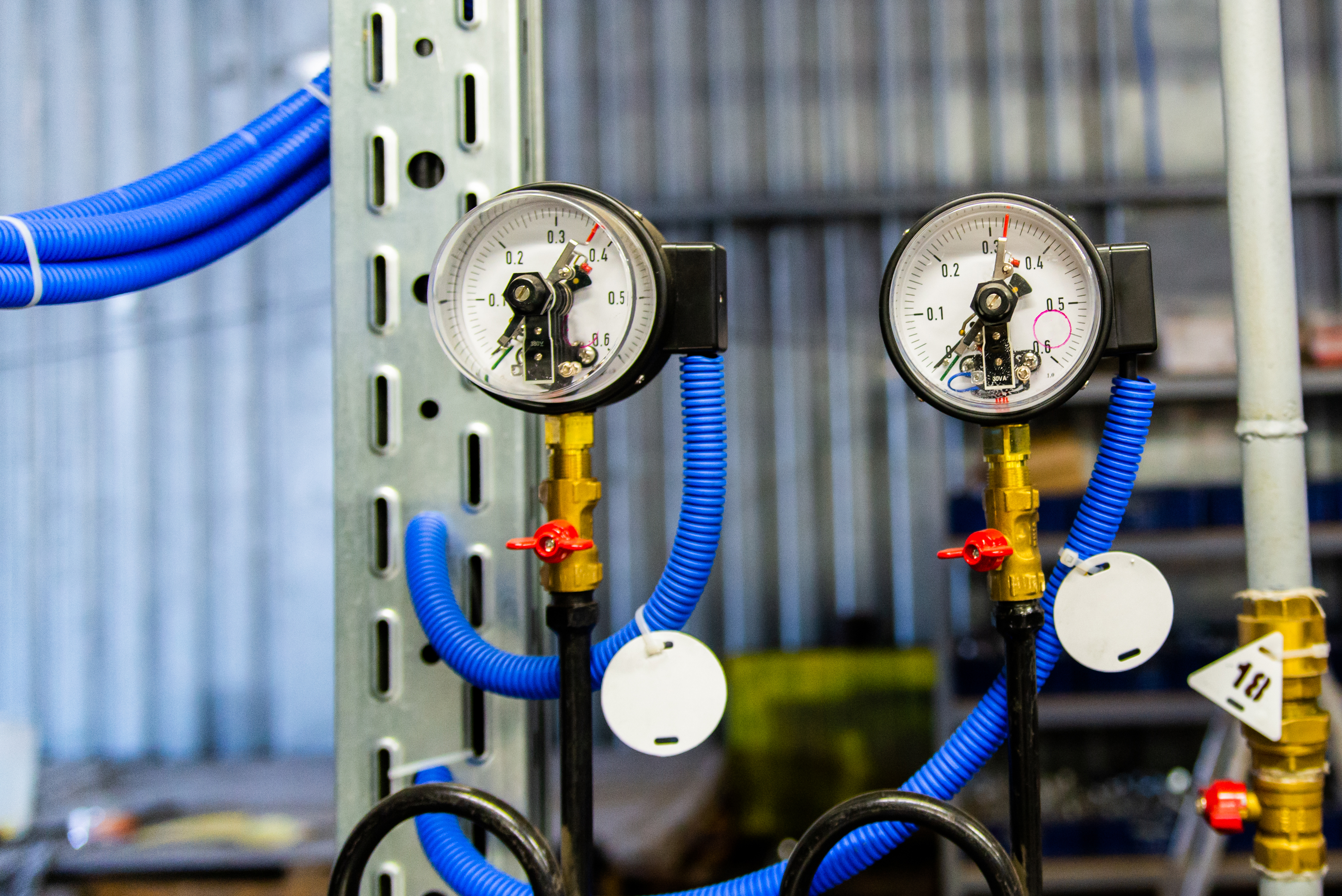 Два манометра с красными вентилями и гибкими синими шлангами, установленные на металлической конструкции в техническом помещении.