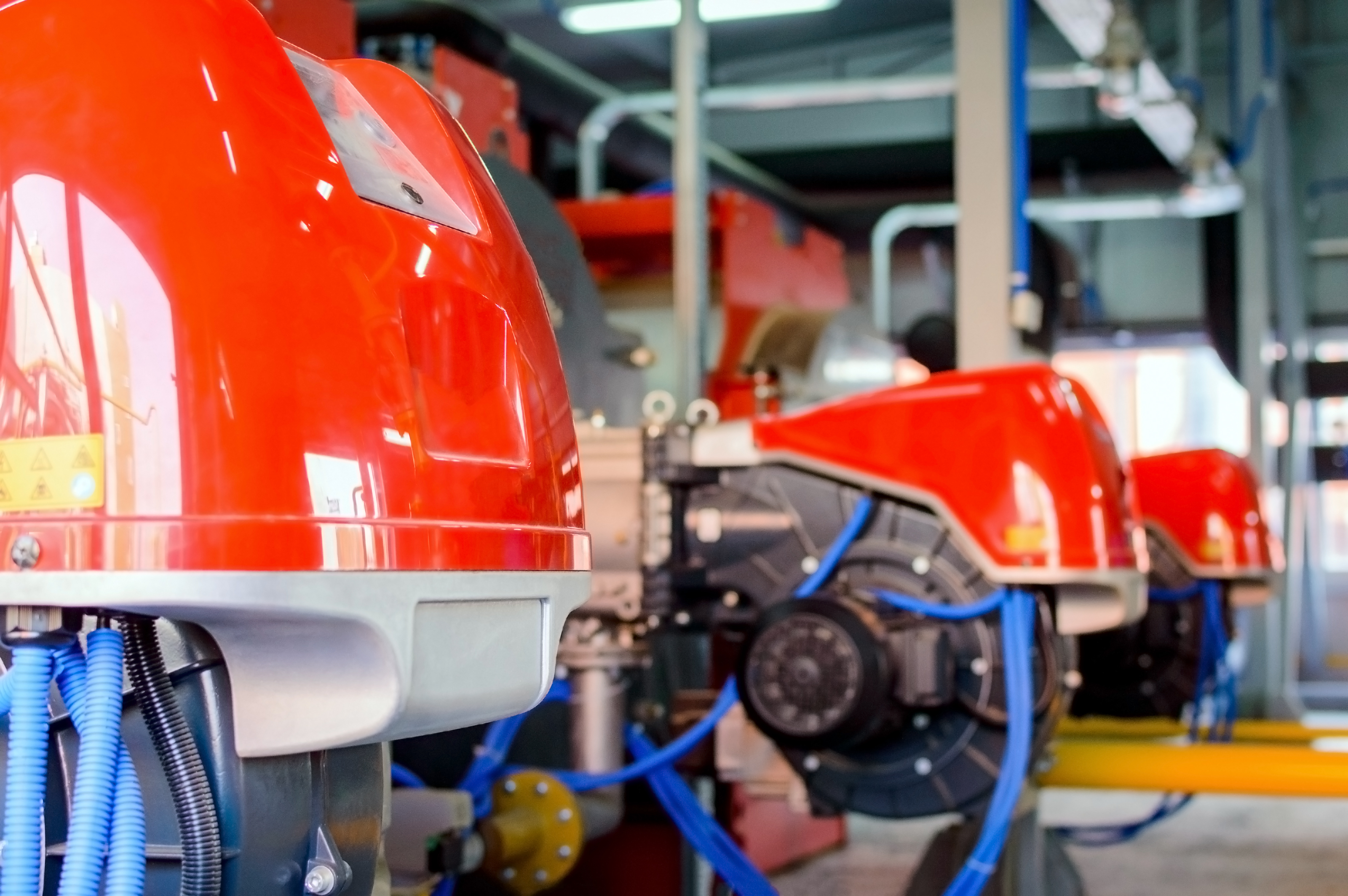 This image immerses the viewer in the atmosphere of modern industrial production, showcasing a series of bright red burners located in a production workshop. The camera lens focuses on the front burner, highlighting its glossy, rich red surface, which effectively reflects the surrounding lighting. Details of the casing, grey plastic elements, and bundles of blue flexible cables neatly arranged in protective conduits are visible, emphasizing the organization and technological sophistication of the process.