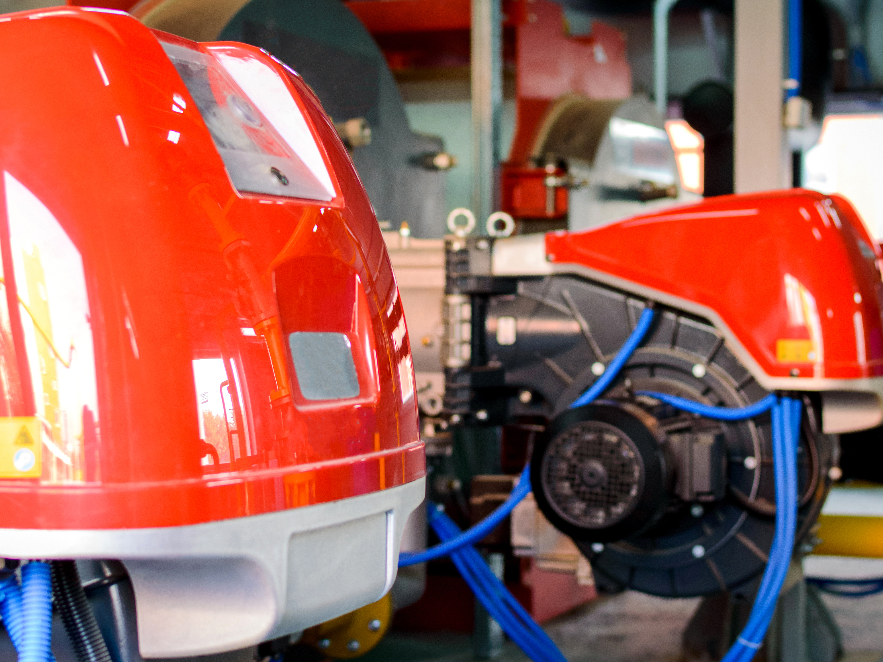 The color palette of the shot is dominated by a rich red color, symbolizing energy, power, and attention. The blue tubes and gray housing elements create a pleasant visual contrast, making the image more dynamic. The background is blurred, which focuses the viewer's attention on the foreground and emphasizes the modern design of the equipment. It can be assumed that this is part of a production line, a heating or ventilation system, or another large industrial mechanism.