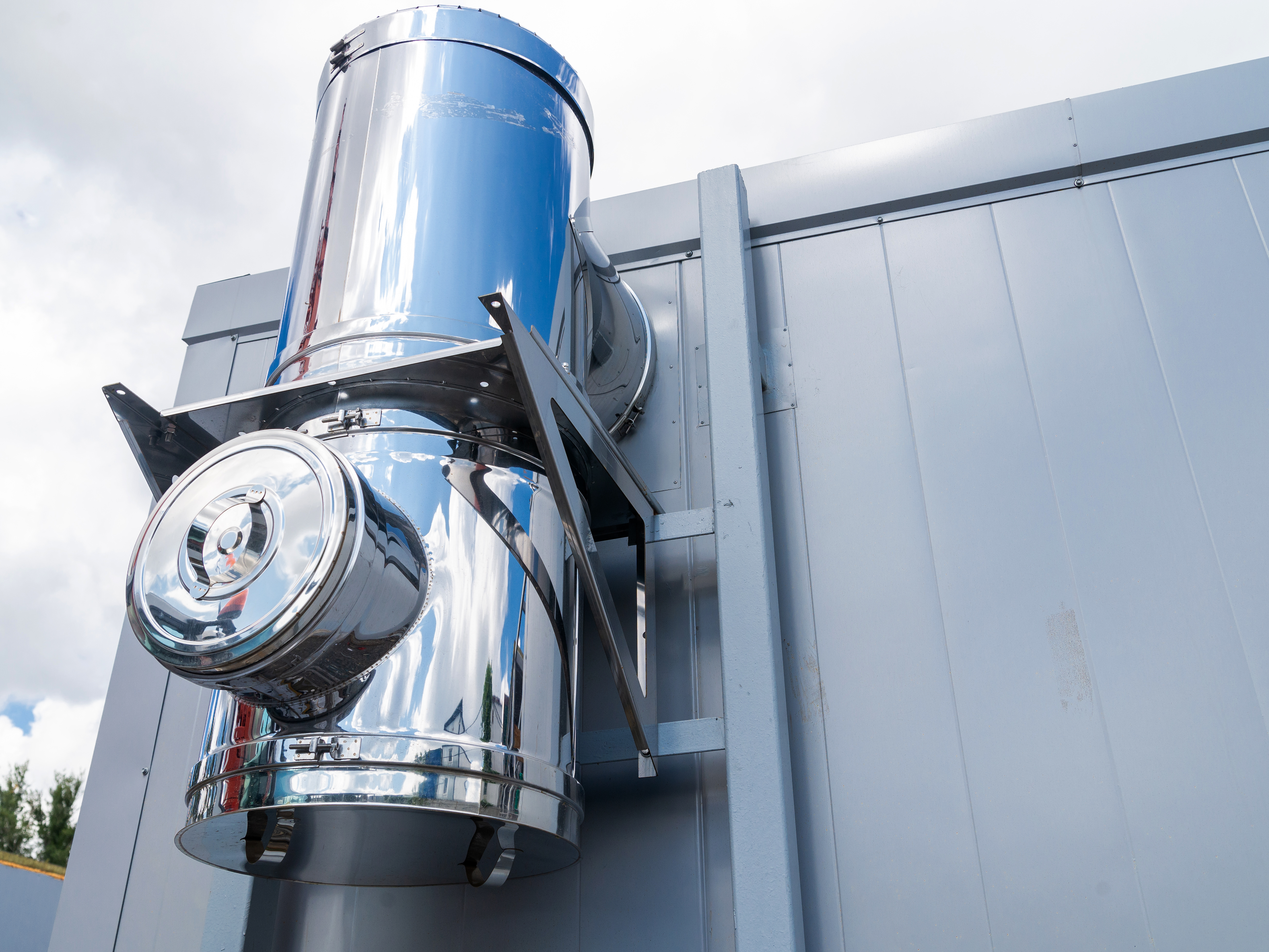 The photograph is taken from a low angle, giving the structure an imposing appearance and emphasizing its scale. The composition focuses on the details of the exhaust system, highlighting the quality of materials and the precision of craftsmanship. This image is ideal for illustrating themes related to industry, construction, engineering, ventilation, and modern technologies.