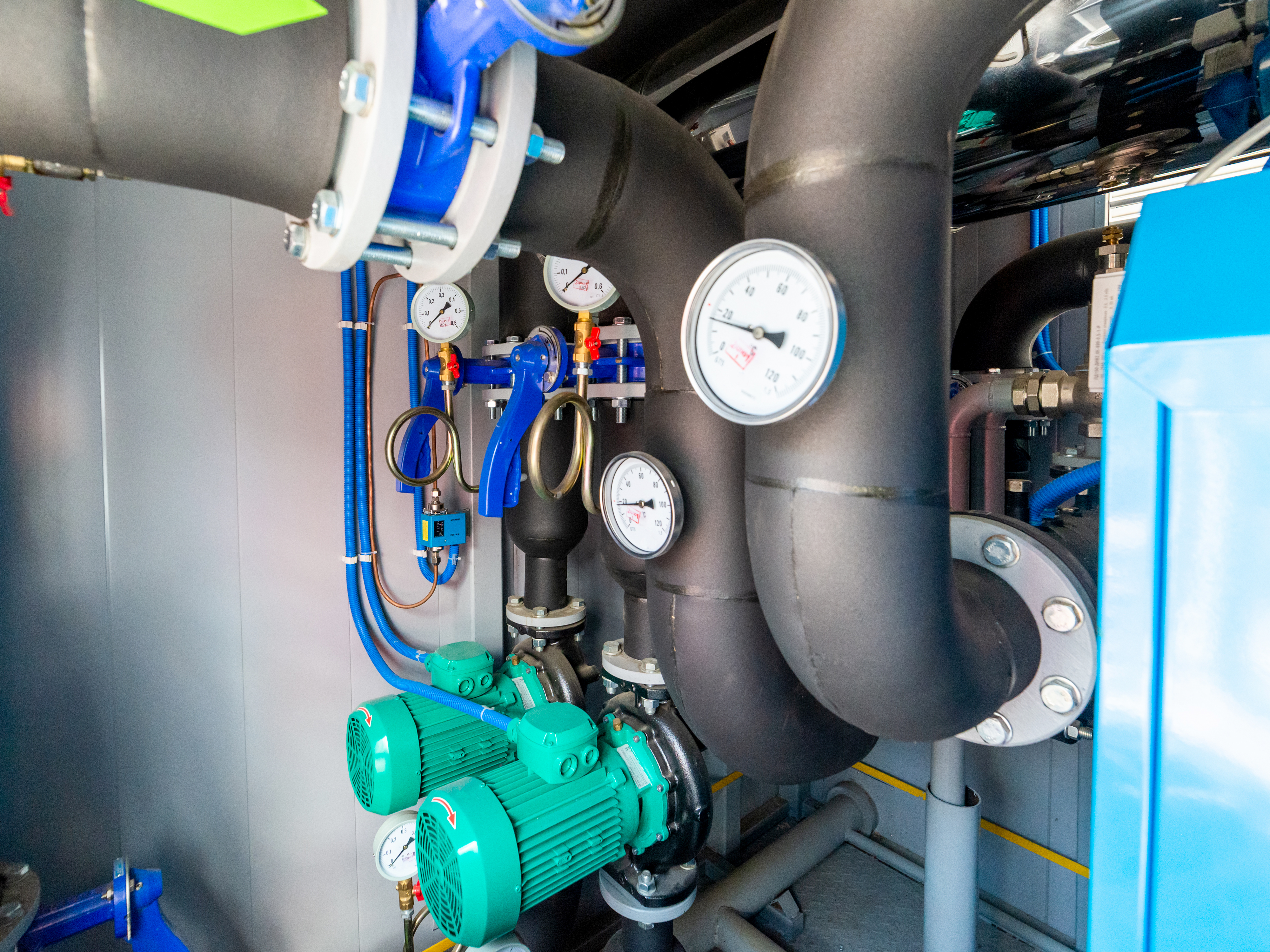 Данное изображение представляет собой крупный план сложной системы промышленного оборудования, демонстрирующей детали насосов, труб, вентилей и манометров. Энергичные бирюзовые насосы с четко видимыми лопастями вентиляторов расположены в нижней части кадра, намекая на их функциональность и мощность. Они соединены с широкими, изолированными трубами, которые изгибаются и соединяются, образуя сложную сеть.