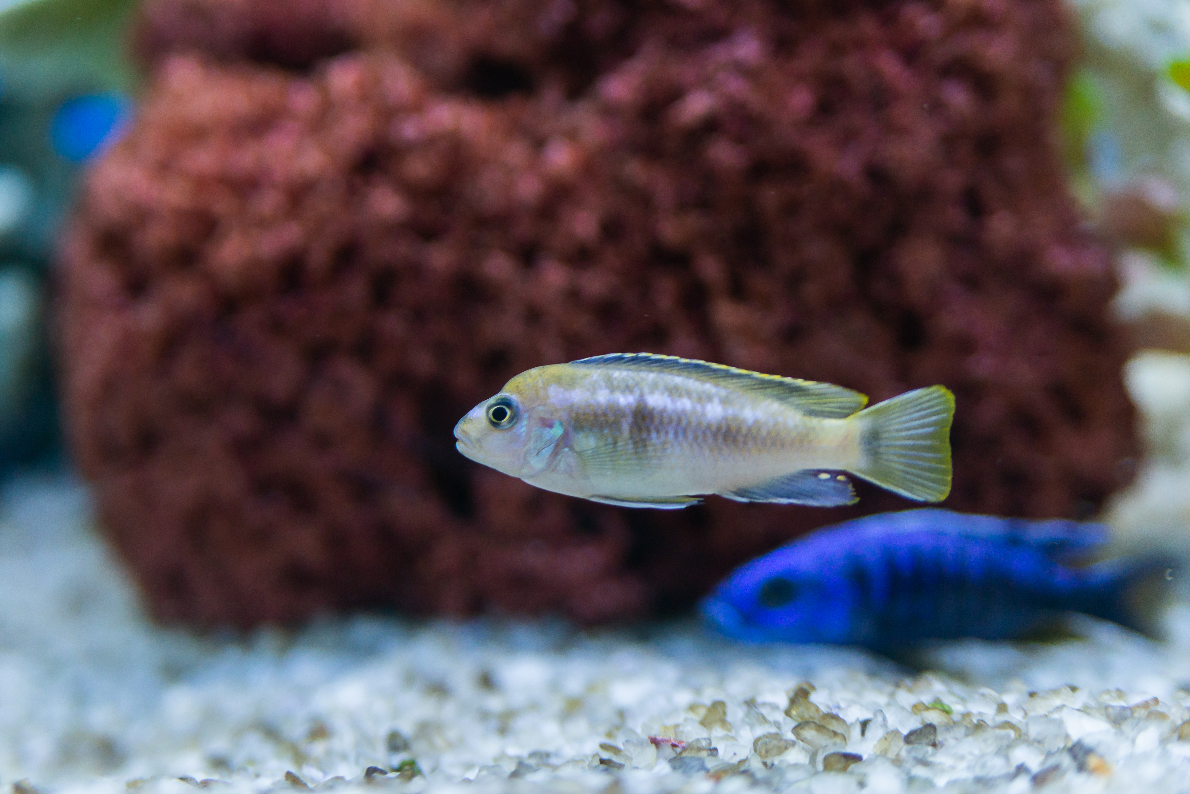 За ней, в мягком расфокусе, видна другая цихлида, окрашенная в насыщенный, глубокий синий цвет. Этот контраст между четкостью одного объекта и размытостью другого придает композиции глубину и художественность. Синий собрат словно растворяется в водной среде, подчеркивая уникальность и выделяя светлую рыбку.