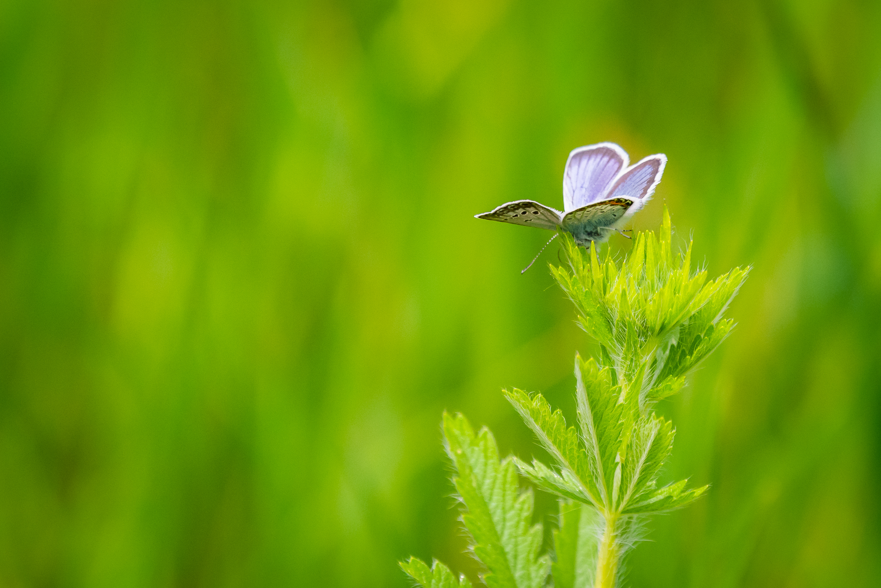 Композиция фотографии акцентирует внимание на этом миниатюрном существе, помещая его в правую часть кадра. Левая часть изображения представляет собой размытый фон из сочной зелени, создающий эффект глубины и подчеркивающий хрупкость мотылька. Игра света и тени на листьях растения добавляет изображению объем и живость. Цветовая палитра состоит преимущественно из различных оттенков зелёного, от ярких салатовых до глубоких изумрудных, контрастирующих с нежным голубым цветом мотылька.