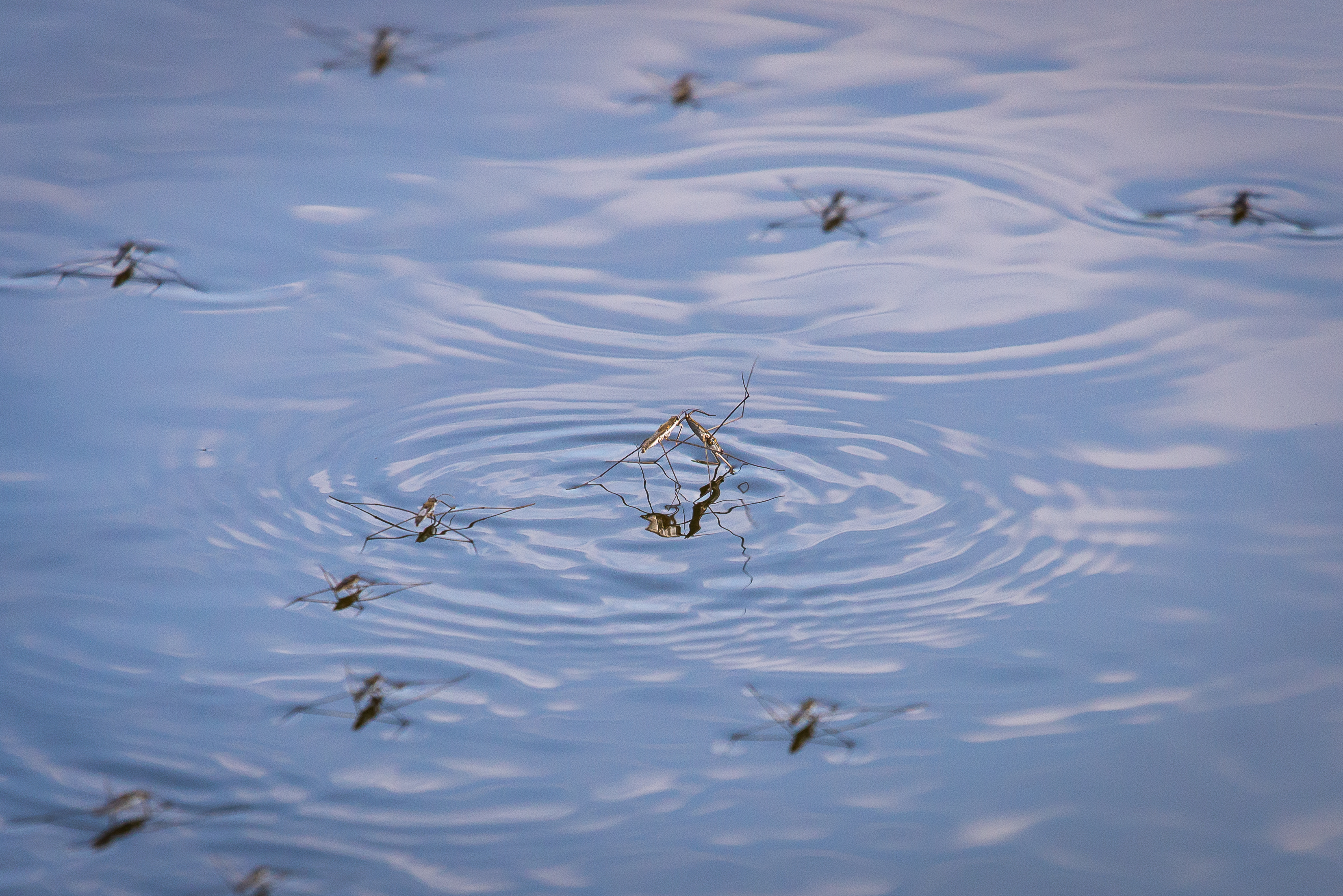 Это завораживающее изображение переносит нас в мир крошечных существ, демонстрируя удивительную способность водомерок (Gerridae) скользить по водной глади. Нежный голубой цвет воды, отражающий небо, создает спокойную и умиротворяющую атмосферу. На поверхности воды видны многочисленные ряби и круги, вызванные движением этих удивительных насекомых. В центре композиции особое внимание привлекает пара водомерок, находящихся в процессе спаривания, что добавляет изображению динамики и рассказывает историю жизни.