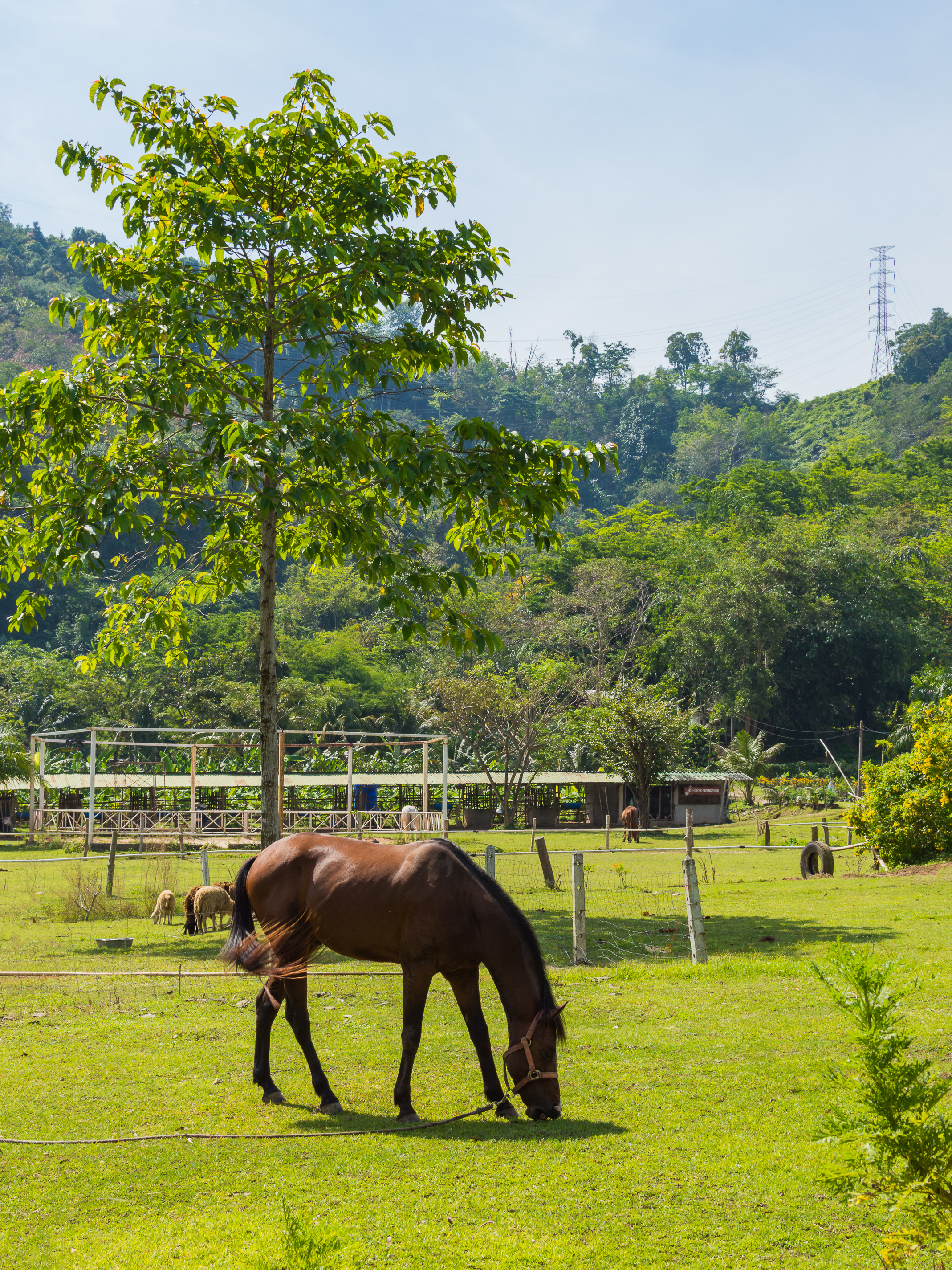 Пейзаж обрамлен густой зеленью деревьев и холмов, уходящих вдаль, создавая ощущение простора и гармонии с природой. Высокое дерево с пышной кроной стоит слева, добавляя композиции вертикальный акцент и глубину. Вдалеке виднеются постройки фермы, заборы и даже опора линии электропередач, что намекает на наличие цивилизации, но не нарушает общую атмосферу спокойствия и естественности.