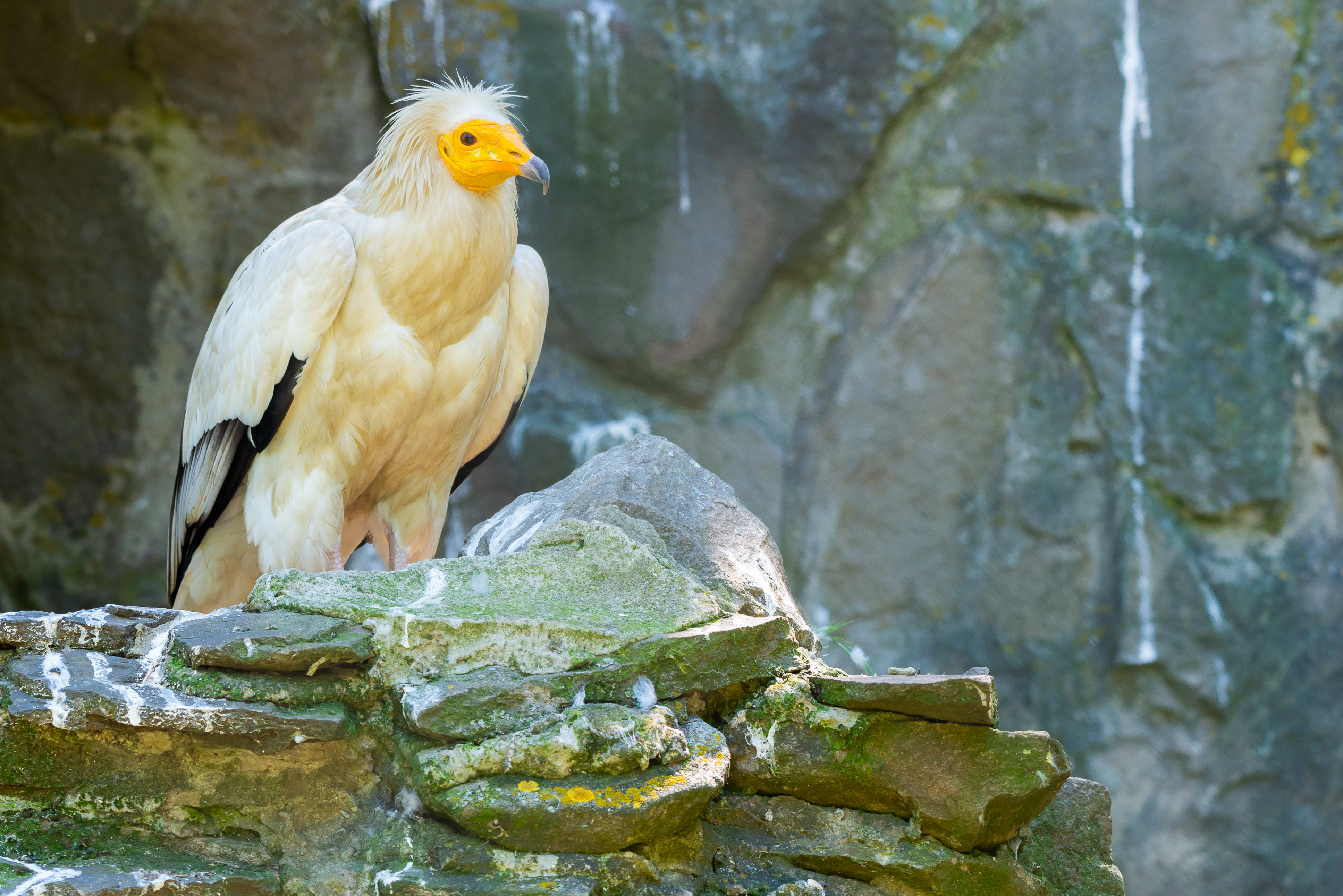 This captivating shot captures the majestic Egyptian vulture, also known as the white-headed vulture, in its natural habitat. The bird is perched on a picturesque rocky ledge, adorned with moss and lichen, which add texture and depth to the composition. The bird's vibrant, almost neon orange beak sharply contrasts with its pristine white plumage, creating a truly impressive sight. Its eyes gaze intently into the distance, as if scanning for prey or surveying its surroundings.