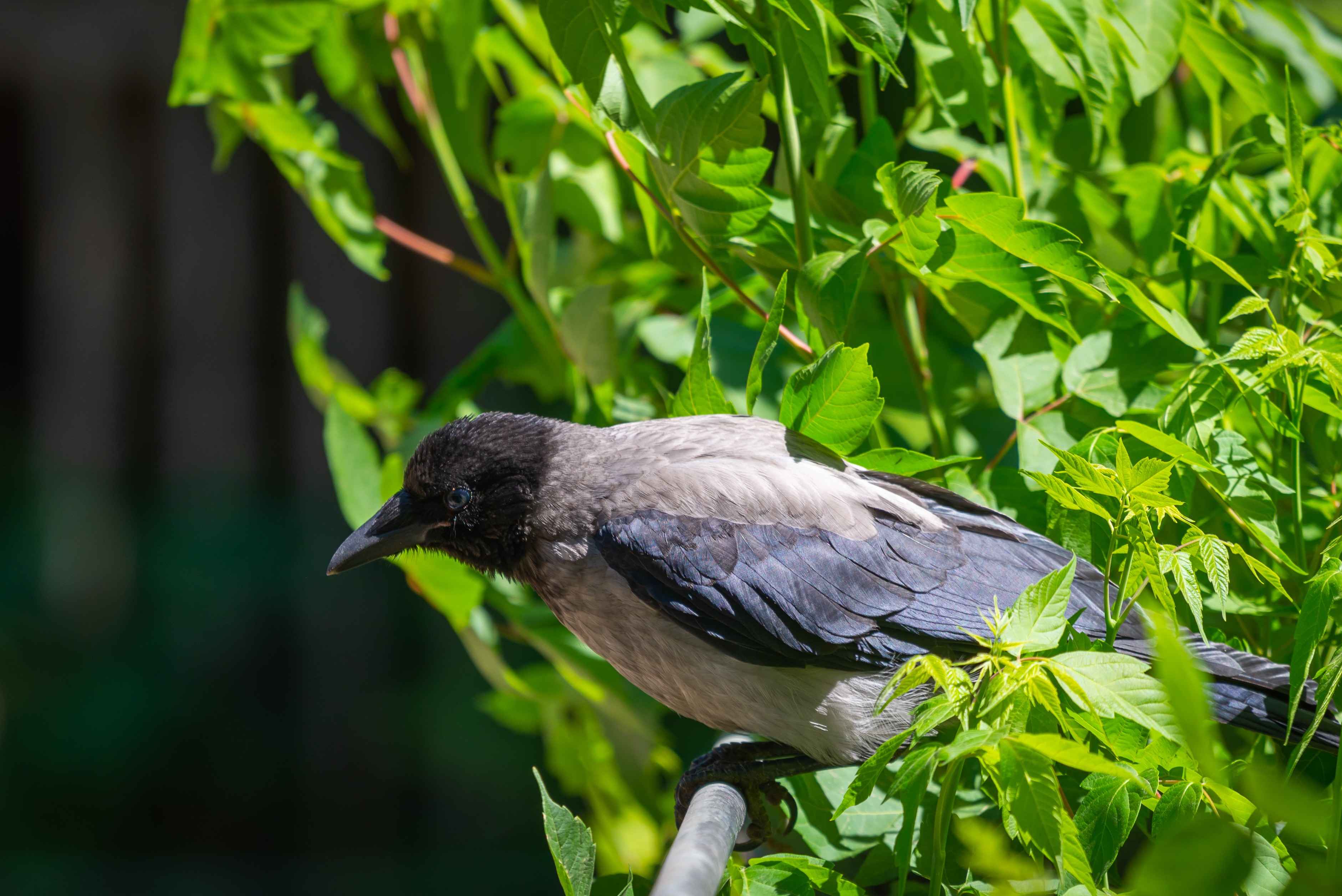Этот снимок запечатлел серую ворону (Corvus cornix) в ее естественной среде обитания, сидящую на ветке среди пышной, сочной зелени. Солнечный свет пробивается сквозь листья, создавая игру света и тени, которая подчеркивает текстуру перьев птицы и живость растительности.