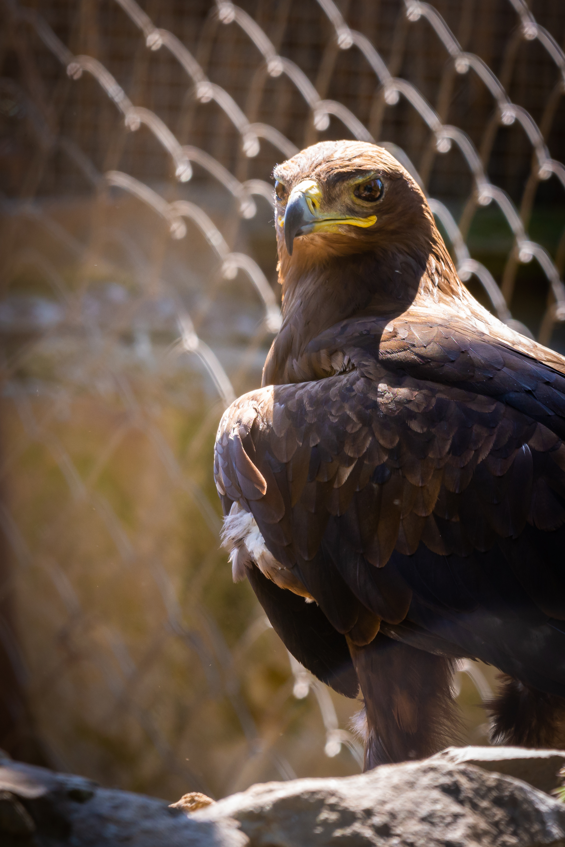 This captivating portrait showcases a majestic eagle perched on a large rock. The bird occupies the central position in the frame, its feathers colored in deep shades of brown, illuminated by soft sun rays filtering through a mesh fence. The eagle's gaze is directed to the side, full of concentration and wisdom, as if it is observing something important or planning its next move.