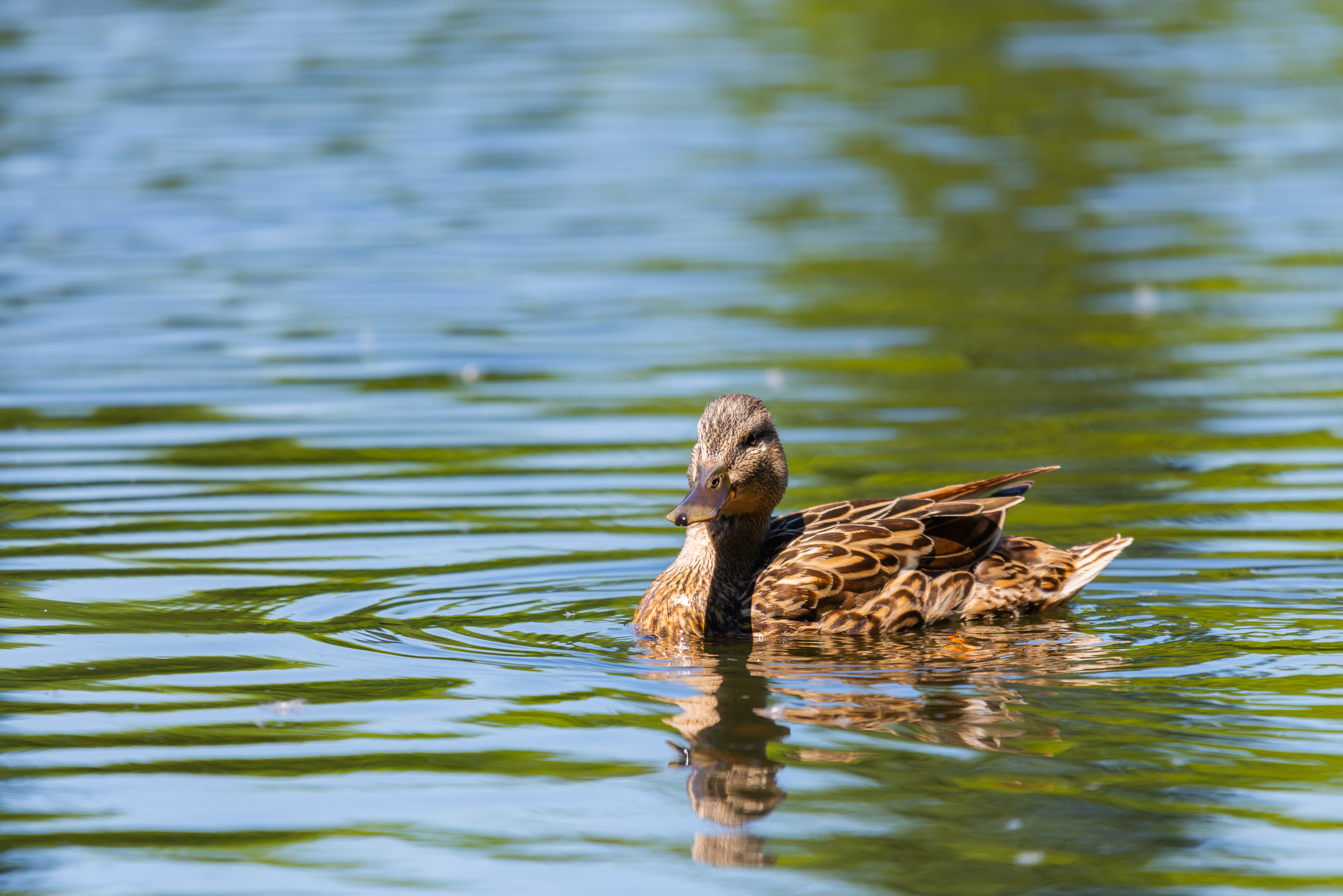 The duck, with its characteristic brown and speckled plumage, is the central subject of the composition. It appears relaxed and confident, as if enjoying the silence and serenity of its natural habitat. The gentle ripples emanating from its movement add dynamism without disturbing the overall sense of harmony. The duck's gaze is directed sideways, lending it an air of mystery and inviting the viewer to ponder its thoughts and intentions.